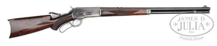 *RARE SPECIAL ORDER DELUXE WINCHESTER MODEL 1886 LEVER ACTION RIFLE. SN 144437. Cal. 33 WCF. Rare rifle with 24″ tapered lightweight rnd bbl, full magazine, pedestal mounted Lyman ivory bead front sight, an unusual blank in the rear seat and a Lyman small disc tang sight. The slot filler in the rear seat has a flat, 1-1/16″ x 5/8″ oval piece of steel attached to its top that is engraved in a scroll and has a mostly obliterated name which may be “WASHINGTON”. Mounted with very nicely figured center crotch, flame grain American walnut with “H” style checkered forearm and capped pistol grip stock with deep, fluted cheekpiece and crescent steel buttplate. Left side of lower tang, under the wood, is stamped with assembly number “580” and “XX”. The matching assembly number is also found in top tang channel of the buttstock and inside toe of buttplate. Accompanied by a Cody Firearms Museum letter identifying this rifle in caliber 33 with rnd bbl, plain trigger, checkered stock with pistol grip, full magazine, rifle butt with cheekpiece, received in warehouse March 2, 1908, shipped March 9, 1908 to Order #139968 and repair and return March 8, 1917. PROVENANCE: Wes Adams Estate Collection. CONDITION: Fine to very fine. Bbl & magazine tube retain 96-97% strong orig blue with some light, minor thinning; receiver retains about 50% thin orig blue with balance a silver patina; hammer retains strong case colors on sides and rear edge with top edge turned silver; lever retains traces of case colors in sheltered areas being mostly a silver patina; wood is sound with a few minor, light nicks & scratches and retains most of what is probably an old factory restored finish which was likely done in 1917 when it was returned to the factory. Mechanics are crisp, bright shiny bore. 4-44454 JR408 (8,000-14,000)