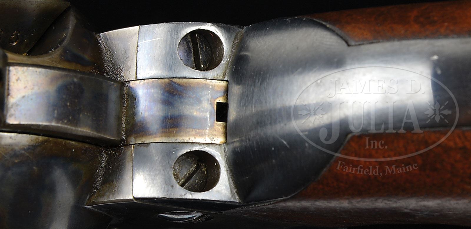 FINE LATE COLT CAVALRY MODEL SINGLE ACTION ARMY REVOLVER. SN 132836. Cal. 45 Colt. Blue & color case hardened with 7-1/2″ bbl, full front sight and 1-line block letter address. Left side of frame has 3-line patent dates and a small “US”. Mounted with 1-pc walnut grip with last four digits of matching SN in backstrap channel. Left side of grip has a mostly legible “SEB” (Capt. Stanhope E. Blunt) inspector cartouche under the date “1890” and the right side a fully legible “RAC” (Rinaldo A. Carr) sub-inspector cartouche. The frame, bbl, cyl & left bottom edge of grip are also marked with the “RAC” sub-inspector initials. Trigger guard, backstrap & end of ejector housing have the “K” inspector initials. Screws & trigger are fire blued. All visible SNs are matching with last four digits of matching SN on bottom of bbl & cyl. This revolver was in the last contracts of governmental orders which were usually issued to state militias which allowed them to escape the recalls of the 1890s and early 20th century where large numbers of Cavalry revolvers were converted to artillery configuration by having their bbls reduced to 5-1/2″ and usually with mixed parts. CONDITION: Extremely fine, all matching including cyl & grip. Bbl retains virtually all of its crisp glossy blue with only faint sharp edge wear on left side and a small scratch on left side; both sides of hammer & ejector housing stud show strong feathers; ejector housing has a couple of small nicks on outer radius and shows very light sharp edge wear; frame & hammer retain virtually all of their orig case colors, brilliant in sheltered areas, lightly to moderately faded elsewhere, thin on the recoil shield; hammer retains brilliant case colors turned a little dark on top edge; trigger guard & backstrap retain virtually all of their bright orig blue with a few small nicks on backstrap; cyl retains about 90% crisp orig blue with scrape lines around outer diameter and shows strong blue in the chambers and bore of the bbl. Grip has a tiny chip on left toe and a couple of dings on each side, shows light to moderate wear and retains most of its orig oil finish. Mechanics are crisp, brilliant shiny bore, appears to be completely unfired. 4-48765 JR334 (30,000-40,000)