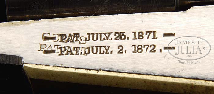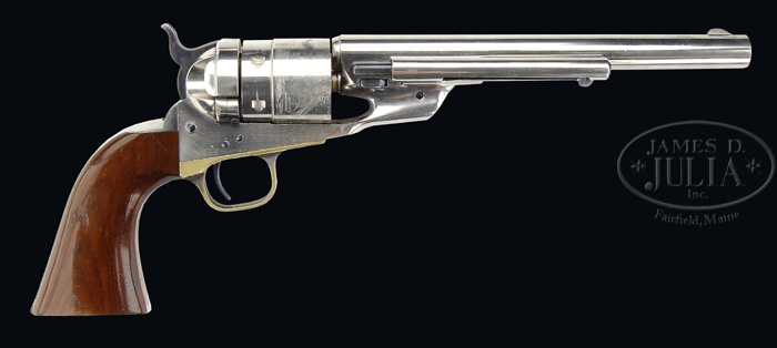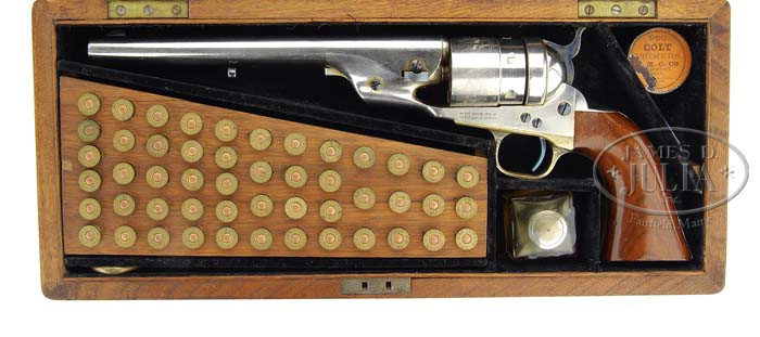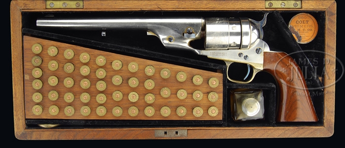 RARE CASED PROTOTYPE RICHARDS MASON CONVERSION COLT MODEL 1860 REVOLVER. SN 193960. Cal. 44 Colt CF. This is believed to be the first centerfire conversion in the Richards Mason style, hand made and finished, one of only a very few made in ca.1871. It has nickel finish with 8″ rnd bbl and 1-line New-York U.S. America address. Left side of frame has 2-line patent dates with dashes, stamped over the orig “COLT’S PATENT”. The inside face of the bbl lug between the frame pin holes is stamped with a small “1”. There is also a very deeply stamped mark on rear face of cylinder that is indecipherable, along with a small “S” on opposite flat. It has a silver plated trigger guard with “44 CAL” on left shoulder and a nickel plated iron back strap and is fitted with very nicely figured 1-pc walnut grip which has the last four digits of the serial number in the back strap channel. It has the usual rebated 6-shot cylinder that has had the rear portion containing the percussion nipples machined down leaving only the extended star wheel. The conversion ring, with loading gate bearing the last four digits of the serial number is made without rear sight, leaving the extended hammer nose with rear sight notch. Firing pin is blind slotted into the flat machined hammer nose and secured with two rivets. The rammer slot in the bbl lug has been plugged in the usual way with attached 4″ ejector rod housing that has a half moon ejector rod head which has been hand checkered on front side. This revolver represents a major step in the evolution from percussion to the Single Action Army revolver as we know it today. Accompanied by its orig black velvet lined mahogany casing, compartmented in the bottom for the revolver, a small square crystal oil bottle with nickel plated brass cap, a very rare tin of UMC/Colt primers, an L-shaped screwdriver and a very rare slot in the front edge which contains a 1911 style brass cleaning rod. Left front portion of the case has a cartridge block containing fifty-one Rem-UMC 44 Colt cartridges. This revolver is pictured on p. 142 of the book The Wm. M. Locke Collection as it is found today without the oil bottle or cap tin. PROVENANCE: William M. Locke Collection; Dr. Joseph A. Murphy Collection. CONDITION: Extremely fine plus, all matching including cylinder & grip except wedge which is properly unnumbered. Bbl, cylinder, frame & back strap retain virtually all of their strong orig factory nickel finish with only a few minor nicks & surface mars. Cylinder retains most of its orig Ormsby Naval battle scene, slightly thinned in one spot during finishing process. Trigger guard retains 15-20% orig silver plating with the exposed brass a medium mustard patina. Grip is sound showing very minor wear to the edges with a small gouge on right side and a few very minor mars in varnish and overall retains about all of its fine orig factory varnish. Mechanics are crisp, strong bright bore with light to moderate pitting. Case is very fine with one minor grain check in bottom and light handling & surface scratches and overall retaining most of a fine restored finish with some heat crazing on the lid. Interior is lightly soiled with some minor wear from front sight & hammer spur. Accessories are fine, cartridges are clean. Altogether an extremely rare & desirable cased set. 4-36421 JR85 (20,000-40,000)