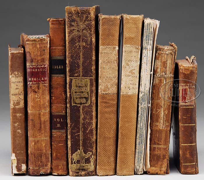 LOT OF NINE BOOKS FROM ASSORTED LIBRARIES. Including 1) Vol. II Memoirs of the Bloomsgrove Family by Enos Hitchcock, 1790 having a Benjamin Lincoln Lear bookplate, also inserted is a 6″ x 3-1/2″ hand colored engraving titled “Thomas Chapman Schoolmaster”. On reverse is hand written “William Smith William Richards Falmouth”. 2) Leather bound book “The Idler” second vol., 1810 with a bookplate of Hugh W. Diamond. The text having a curious cipher annotations on almost every page with underlying phrases having off to the side the first letter of each word in a continuous new word. 3) First edition “Illustrations of Political Economy No. III” by Harriet Martineau, 1832. 4) “The Deformed Transformed, A Drama Paris, 1824”. 5) “The Court and City Register 1794, London”. 6) “The Traveler’s Pocketbook” 23rd Edition, 18th Century. 7 & 8) Two volume set “Retrospect of Western Travel” by Harriet Martineau, 1838. 9) “The Oriental Annual” or “Scenes in India”, London, 1836 with 22 engravings after original drawings by William Daniell. CONDITION: Books show use, generally intact. 9-98704 (400-600)