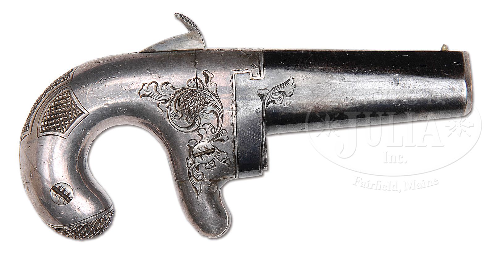 MOORE’S PATENT. F.A. CO. BROOKLYN N.Y. SECOND VARIATION DERINGER. SN 3. Cal. 41 Short RF. This gun is 2nd Variation having February 19th, 1861 patent, engraved on top of bbl Also has “D. Moore Patent” stamped on top of bbl flat like 3rd Variation. “EXPLANATION” normal 3rd types have 2 stamps, which read as above. This piece was made before the other stamp was included. Only 2 others are marked like this and they are SN 26 & 30. This piece is SN 3. PROVENANCE: L.D. Eberhart Collection. CONDITION: Rarest of all Moore finishes, blue bbl and silver plated frame. Engraving is a little more than average coverage having additional thumbprints, one on each side of backstrap. Bbl retains 80%+ of original, bright blue. Hammer retains 80%+ of original blue. Brass frame retains 98% of original silver finish. There is a starburst pattern over breech. 4-47382 DE4 (3,500-5,500)