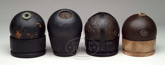 LOT OF FOUR 12-POUNDER CANNONBALLS. All excavated. 1) 12-pounder Bormann fused cannonball (lacking fuse). Disarming hole opposite fuse hole. 2) Possible Revolutionary War cannonball, due to the small fuse opening. Brass bushing that slides into the fuse hole (not orig to the shell). 3) Confederate 12-pounder with an authentic wooden time fuse (not orig to shell). Possible polygonal cavity interior. 4) 12-pounder solid shot on reproduction sabot and straps. All rest on reproduction sabots. CONDITION: All with light to medium pitting. 4-55814, 4-55817, 4-55818 & 4-55819 JM86 (400-600)