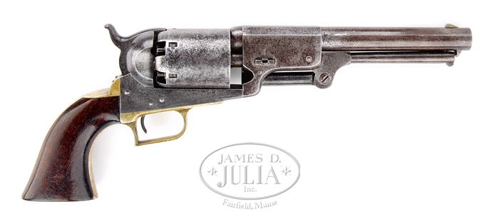 MARTIALLY MARKED COLT SECOND MODEL DRAGOON PERCUSSION REVOLVER. SN 10731. Cal. 44. Usual configuration with 7-1/2″ oct to rnd bbl, German silver front sight with usual bbl marking. It has a tiny “U.S.” below COLT’S PATENT” on left side of frame and brass grip frame with square back trigger guard and tiny inspector initials on most of parts, including left bottom edge of 1-pc walnut grip. Grip has been refinished, obliterating cartouches which were undoubtedly present before refinishing. It has a matching number in ink in backstrap channel. CONDITION: Fine, all matching except wedge which is numbered either “68” or “89”. No orig finish remains being a smooth gray/brown patina with small spots of scattered light pitting. Cylinder is identical condition and retains 35-40% Ranger-Indian fight scene and four of six safety pins are prominent. Grip frame is a medium mustard patina and grip is sound showing moderate wear and retains an amateur restored finish. Mechanics are fine, bright shiny bore with a few scattered spots of light pitting. 4-32308 JR353 (8,000-12,000)