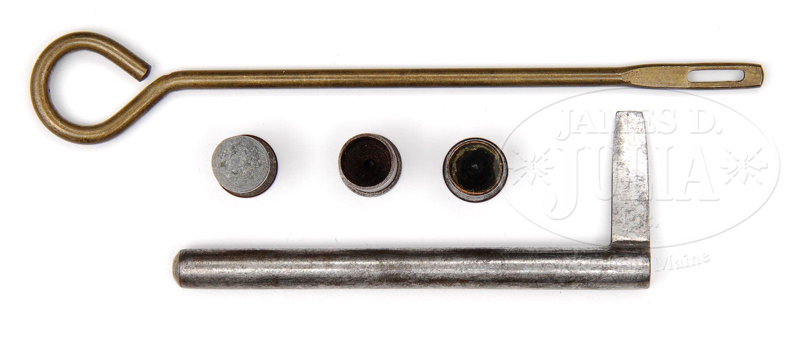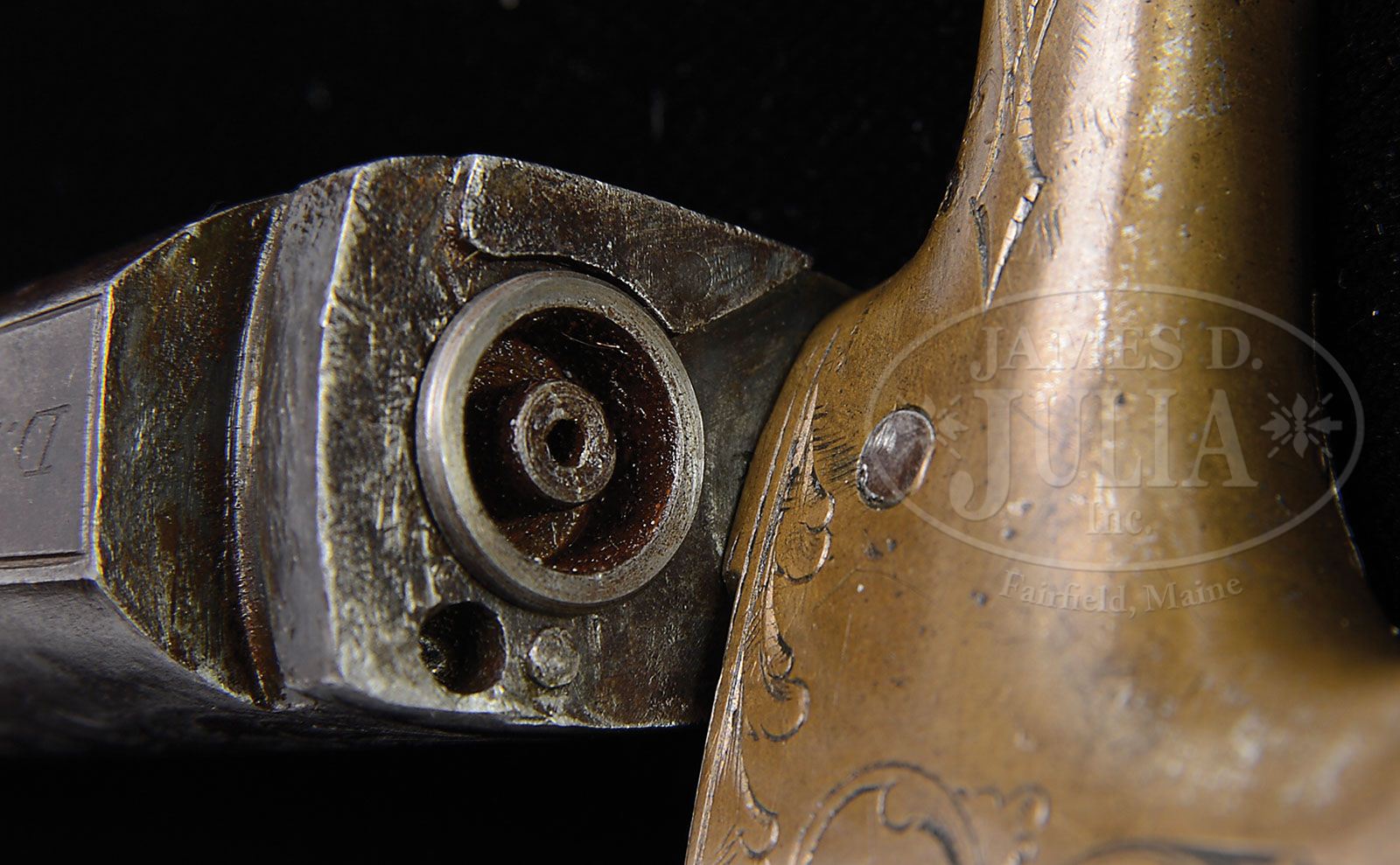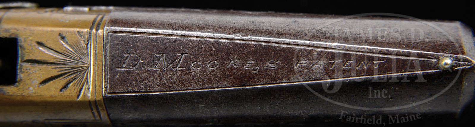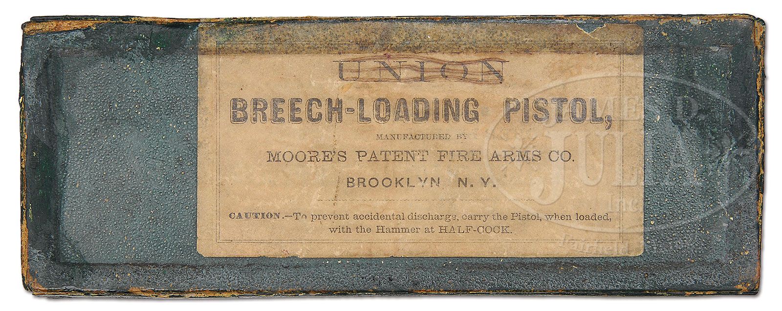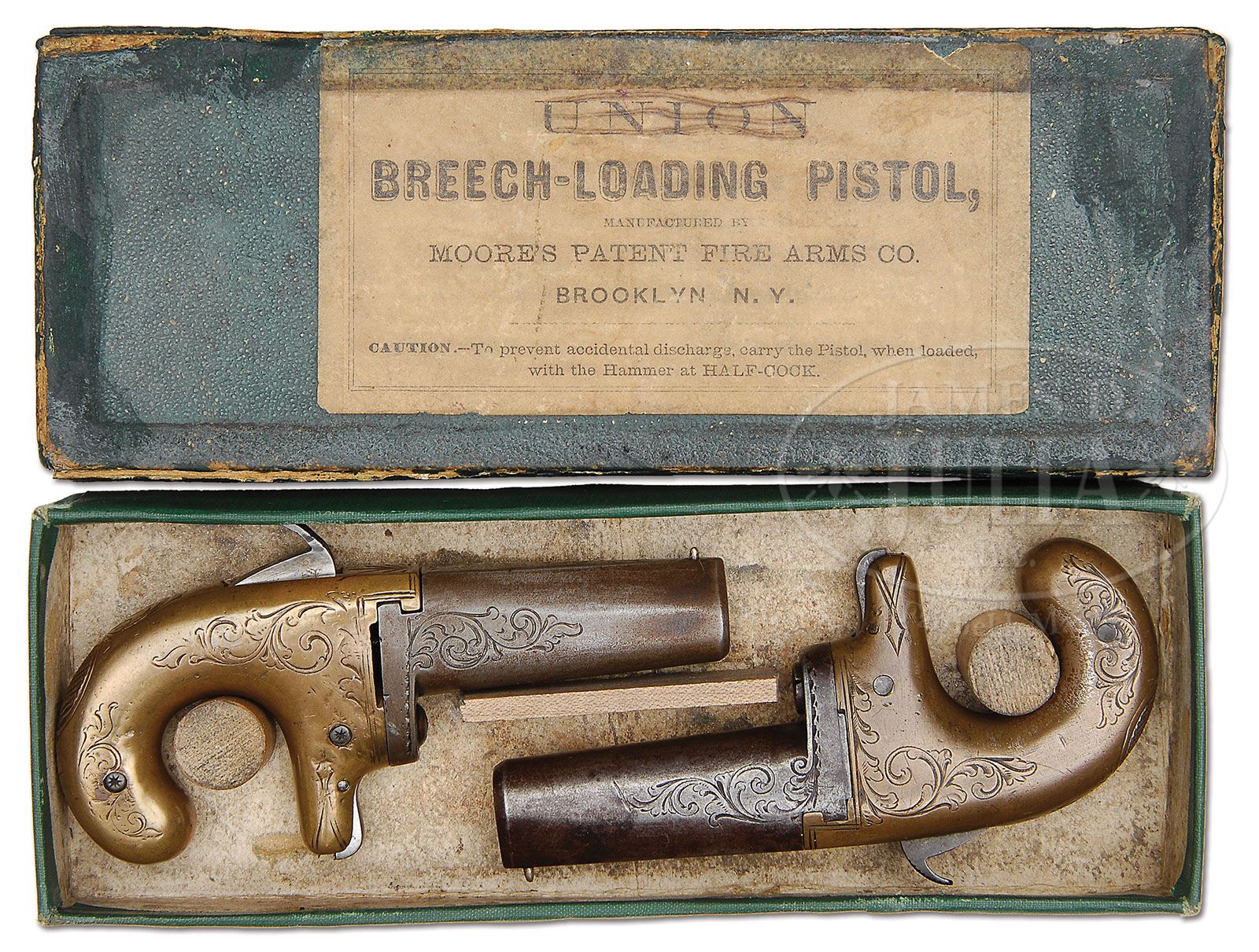 PAIR OF MOORE’S PATENT. F.A. CO. BROOKLYN N.Y. FIRST VARIATION DERINGERS. SN 9 & 10. Cal. 41 Short RF. Cased in ONLY KNOWN original cardboard box, note the wooden dowels which hole the guns in place. This is a feature which Colt would later use in their cardboard boxes. This matched pair of First Variations are consecutive SN. Also in accompaniment are the original turn screw cleaning rod combination, which is the only original tool of its type known to the author, and a brass cleaning rod. Also included are the three styles of original ammunition used in these guns including the inverted nipple percussion cartridge, only 3 are known to be in existence by the author, which will fit either gun in this early series. Also included is early center fire shell casing of the very rare Goldmark Cartridge Company (fulminate) of mercury centerfire, which there are only 2 known specimens of, and 1 original short RF cartridge to illustrate the differences between the ammunition. Both guns have the bbl release button on left hand side of frame. Only the first 48 examples of this gun have that special feature. To the author’s knowledge there are less than 15 of these guns known to exist today. Both of these guns were deluxe engraved. At the time of production almost every one of the first 48 had some variation of address. SN 9 has an engraved company legend on bbl flat “D MOORE,S PATENT” and SN 10 has 2 line stamp of “PATENT APPLIED FOR” in an oval engraving covering entire bbl flat. These First Variation Moore’s, which are all centerfire, have a see through vent between bbl and frame recoil shield so that the owner can see, at a glance, if the piece is loaded. PROVENANCE: L.D. Eberhart Collection. CONDITION: Both guns are engraved alike, even to the starburst over breech, except for company legend. It should be noted here that in these first 48 guns almost every one is different from each other in some form or fashion. At that early stage they were trying to put out guns as quickly as possible and very little standardization was used. The guns retain none of the original, overall silver plate finish. Accompanying box is all original and has had some restoration; labels are all complete both interior and exterior. It should be noted that the label on top of box, the top line started off with “UNION.” It is unknown why this was done and some Southern gentleman did try to mark that out with a pencil, otherwise it is fine. 4-47385 DE7 (25,000-35,000)
