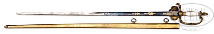 SOUTH CAROLINA MILITIA SWORD. This antebellum South Carolina militia sword dates circa 1850 and several examples are known carried by South Carolina officers during the Civil War. This pattern exhibits 3″ languet with South Carolina state seal consisting of raised relief of Palmetto tree above the date “1776”. Pommel is of a helmeted figure and knucklebow terminates into an eagle head quillon. Solid brass scabbard is engraved with floral and geometric decoration. Grip contains 2 large mother of pearl panels. Blade, which is in near new condition, has blue and gold decoration with central panels of panoply of arms. CONDITION: Brass hilt, pommel and languet have yellow/mustard patina. Scabbard has yellow patina under old cleaning and small traces of orig gilt with scattered small dings, small dents and scratches. There is a set of scratched initials at top of scabbard which are only partly discernible, as can be seen in photos, which might represent the sword’s owner who carried it. The 30-3/4″ blade is white/bright with 13″ blue and gold etched panels. Blue and gold decoration is over 90% intact (as can be seen in photos). 4-46074 JS27 (5,000-7,000)