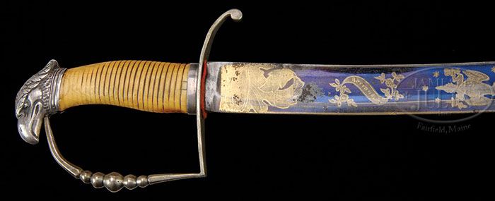 HANDSOME PHILADELPHIA STYLE SILVER-MOUNTED EAGLE HEAD SABRE W/SCABBARD. Wonderful imported sword circa 1805 with 30 1/2″ curved three color blade, 1-5/16″ at the ricasso. Blade has sgl fuller and blue and gilt etched blade with foliate patterns and a trophy of arms with liberty cap on left side and foliate patterns on right side with “Warranted”, a Federal eagle w/ “E Pluribus Unum” in a riband. It has silver, eagle-head pommel with classic 5-ball silver-plated D-shaped handguard and hilt w/ round quillon with ribbed ivory handle and silver ferrule. Accompanied by its orig silver mounted leather scabbard. PROVENANCE: This exact sword appears as color plate X in “The American Eagle-Pommel Sword” by Mowbray. Ex Retzlaff Coll. CONDITION: Very fine. Blade is excellent, bright with no nicks and light scattered spots of moderate oxidation with most of the blue and gold etched patterns intact .Ivory handle is hand worn and has taken on a honey gold patina. Silver has rubbed a bit on handle otherwise fine. Scabbard body is sound and pliable with some crazing and loss of original surface but is complete and fits well w/ proper recoloring. Silver mounts are fine. 4-46898 JWD22 (5,500-8,500)