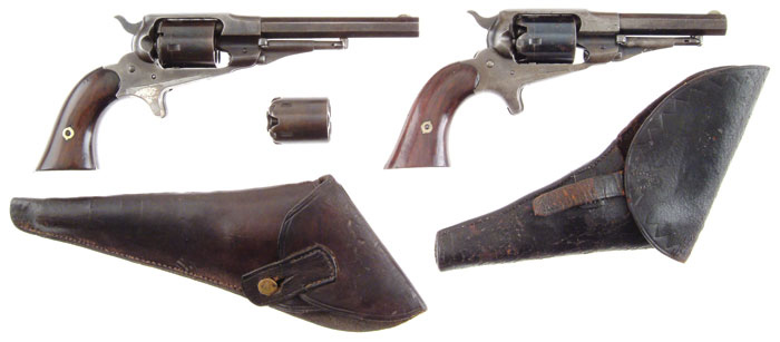 LOT OF TWO REMINGTON POCKET REVOLVERS WITH HOLSTERS & ONE SPARE CYLINDER. Cal. 31. 1) 2nd Model. SN 16814. Conversion #1420. Blued finish with rare 4-1/2” oct bbl with crisp markings, silvered brass trigger sheath, 2-pc rosewood grips. Accompanied by orig black leather flap holster & spare percussion cylinder. CONDITION: Good. Traces of orig blue. About 80% of silver on trigger spur remains. Right grip has been cracked & repaired, and both have been refinished. Bore is evenly pitted. Mechanically good. Holster has lost about half of its black finish & top of belt loop has been repaired with wire. Cylinder also has enhanced patina. 2) 3rd Model. SN 208C4. This is apparently a mis-stamp for 20864 which appears in pencil on the inside of both grips. The number on the bottom of the barrel is not readable. Blued finish with 3-1/2” bbl with three line markings, steel trigger sheath, 2-pc rosewood grips. Accompanied by orig leather flap holster with strap. CONDITION: Traces of original blue; mostly light brown patina with some enhancement. Bore is lightly pitted. Action is good. Holster is lightly flaked but still supple. 4-59403 JH55 (750-1,250)