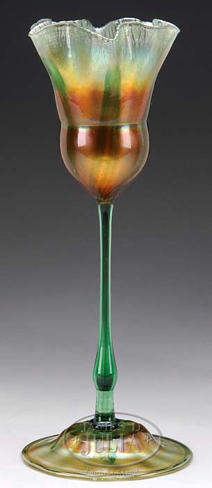 TIFFANY FLOWER FORM. Very pretty Tiffany flower form has inverted saucer foot with gold iridescence and a green pulled leaf design extending from the stem. The stem is a lovely transparent green leading to the flower form cup with rich orange iridescence and subtle green pulled feather decoration. Vase is finished with a ruffled and stretched rim. Vase is signed on the underside “L.C.T.” and numbered “o2012”. SIZE: 11″ h. CONDITION: Very good to excellent. 5-67851 (10,000-15,000)
