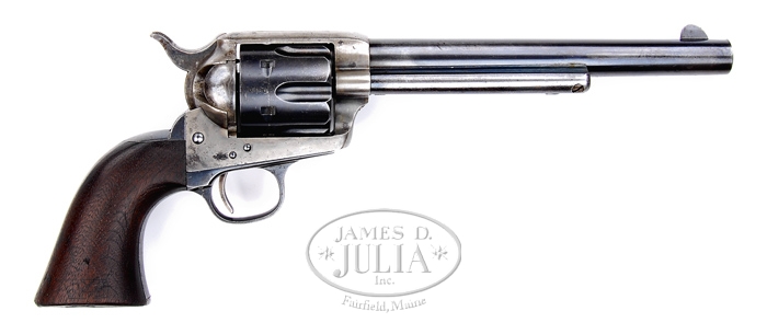 COLT CAVALRY MODEL SINGLE ACTION ARMY REVOLVER SN 139547. Cal. 45 Colt. This revolver is from the last contract for cavalry revolvers and bears the sub-inspector initials of “RAC” for Rinaldo A. Carr. It has 7-1/2” bbl with full front sight & block letter address. It has second type ejector rod housing with half moon ejector rod head. Left front of frame has 2-line patent dates with a small “U.S”. It has 1-pc walnut grip with a legible date of “1890” and legible cartouche of “SEB” for Stanhope E. Blunt on left side and the faint but legible “RAC” cartouche on right side. The “RAC” initials are also found on bottom of bbl, frame, bottom of left edge of grip & cylinder. Trigger guard has a “K” sub-inspector initial. CONDITION: Fine, all matching including grip. Bbl retains 65-70% strong orig blue with most of wear on left side. Frame retains 35-40% case colors, mostly in sheltered areas, bright in front gullets. Hammer retains 40-50% faded case colors, stronger on right side. Cylinder retains about 90% strong orig blue, somewhat thinned with edge wear. Trigger guard retains about 75-80% strong blue & backstrap & buttstrap about 60%. Grip is sound with chipped left toe and some crude initials carved on bottom right side and shows moderate wear & retains a dark, hand worn patina. Timing needs adjusting, otherwise mechanics are fine, bright shiny bore with a few scattered spots of light pitting. 4-32302 JR494 (10,000-15,000)