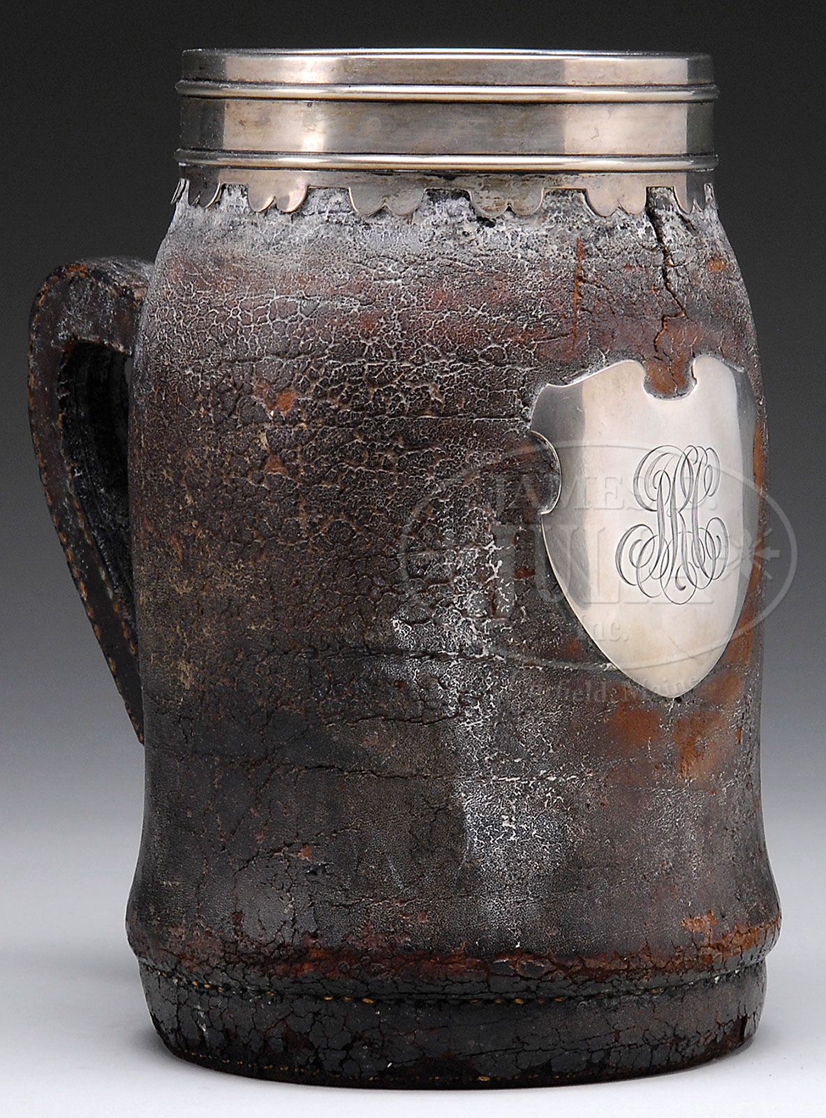 LEATHER & STERLING TROPHY MUG BY GORHAM SILVER CO. The top rim marked with the Gorham hallmark, “AY 455” and “Sterling”. The mug shaped form having a strap handle and centered shield in silver with triple monogram. SIZE: 9-1/2″ x 5″ dia. at rim. PROVENANCE: The personal property of award winning American actress, singer, and best-selling author, Polly Bergen. CONDITION: Some age cracking and splits to stitches, otherwise good. 7-70137 (500-700)