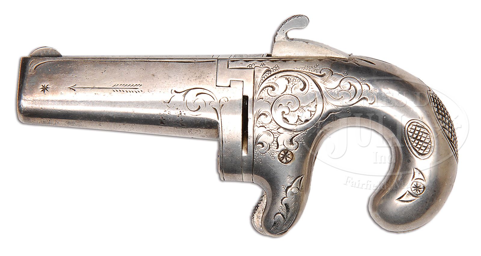 MOORE’S PATENT. F.A. CO. BROOKLYN N.Y. FIFTH VARIATION DERINGER. SN 1987. Cal. 41 Short RF. Standard Moore pattern engraving with spread eagle engraved over breech with arrows down each side of bbl Evidently, in the beginning this was a ladies gun in that it is engraved on right side of exterior of firewall “ZOEY”. PROVENANCE: L.D. Eberhart Collection. CONDITION: Gun is finished in silver plate, overall, of which 95% remains, even on hammer. 4-47390 DE12 (2,000-3,000)