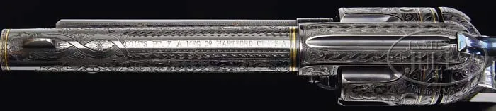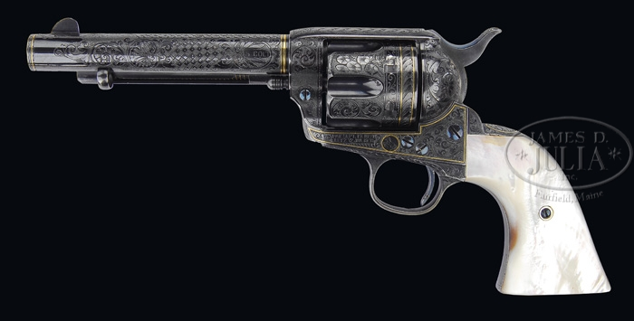 THE WORLD’S MOST FAMOUS ENGRAVED & GOLD INLAID COLT SINGLE ACTION ARMY REVOLVER, THE SEARS & ROEBUCK “COW BOY” SPECIAL. SN 172485. Cal. 45 Colt. The Sears & Roebuck Colt Single Action Army Revolver, like few other firearms known, has reached near-mythical legend since it was discovered in recent years. It has the belonged to several notable collectors and is almost completely documented from its production in 1897 and shipment to Sears & Roebuck in Chicago where it was used as a promotional item in their advertising & catalogues. Apparently when Sears was no longer using this wonderful piece in their advertising it was relegated to a storeroom or one of the company officials’ office displays, it was sold to an unidentified private individual and remained in the Chicago area until 1954 when the famous singer & actor, Mel Torme, learned of its existence through Mr. Ted Busse, a salesman for Klein’s Sporting Goods Store in North Chicago. He purchased it after much agonizing for the grand sum of $750.00, a truly substantial amount of money in that day & age when an ordinary Colt Single Action could be purchased for $50.00 or less. This fabulous Colt remained in Mr. Torme’s collection until 1975 when he was tempted to sell it to Mr. John Solley for the astronomical sum of $100,000. From Mr. Solley it was sold to David S. Woloch, then to a private collector in Texas and from there to Stanley Shapiro. There are probably other owners between Mr. Shapiro and Dr. Murphy who are unknown at this time. Of the total Pre-WWII production of 357,859 Single Action Army revolver only about a single handful are known with factory engraving and gold inlay. In addition to the Sears & Roebuck colt simply being a superior price, it is also one of the most rare. This fantastic Single Action Army revolver is described as having a 5-1/2” bbl with orig full front sight, 1-line block letter address and the caliber marking on left side. Left side of frame has 2-line patent dates and it is fitted with exceptional 2-pc pearl grips that are unusually Bas relief carved with the figure of seated Columbia holding a staff & cap at her right side. It has D+ coverage spectacular engraving by master engraved Cuno Helfrecht with beautiful intertwined foliate arabesque patterns on frame, recoil shield & loading gate. Top strap has braided rope patterns down each side. The bbl has extensive coverage with foliate arabesque patterns, some of which terminate in flower blossoms with beautiful shell patterns on each side surrounding a diamond & dot checkerboard pattern. Bbl address is very nicely framed with multiple borders of chip & dot, straight lines and feather patterns which terminate toward the muzzle in a figure-8 pattern around front sight. Ejector rod housing has foliate & arabesque patterns at each end with a vine & leaf pattern on outside radius with a snake pattern in top gullet and fine side patterns. Bbl has wide & narrow gold bands at the frame end with a narrow gold band at muzzle. Engraving on the frame itself is outlined with a fine gold wire border and the rampant Colt on left side is within a gold circle. Cylinder is spectacularly engraved with four different patterns of engraving on the lands between the flutes, consisting of three panels of foliate arabesque scrolls, another of flower blossoms & stones, still another of different flowers and the last one of multiple flower, foliate & leaf patterns. The bands between cylinder stop notches & approaches are lightly engraved with foliate arabesque patterns and two fine borders. Rear of cylinder has a feather pattern border between two fine gold bands. Top of back strap is engraved with a beautiful foliate fan pattern outlined in gold wire with foliate arabesque patterns down back strap, at the heel and across buttstrap. Trigger guard is engraved to match with another fan around the frame serial number. All engraving has an extremely fine punch dot background with delicate & fine shadings. Accompanied by its orig gray suede covered, French fitted casing that has a purple satin lining in the lid with gold edged ribbon over center and a purple velvet lined bottom that is recessed for the revolver and a pillow shaped covered cartridge recess in right front. This casing is similar to earlier Colt factory casings. This revolver is pictured in full color on p. 421 of The Colt Engraving Book, Vol. I, Wilson, on pp. 157-159 of Fine Colts The Dr. Joseph A. Murphy Collection, Wilson. Accompanied by three issues of Man at Arms magazine: March/April 1983 which contains a 5-page article on this revolver by R.L. Wilson along with full color center photographs; November/December 1985 which includes the aforementioned advertisement by Clark Cail on p. 11; and September/October 1988 which includes a 2-page guest editorial by Mel Torme wherein he mentions selling this revolver and being presented with a facsimile serial number 172485 for giving a concert at the Benefit Auction Preview for the Metropolitan Museum of Art Department of Arms & Armor in New York in October 1985. That facsimile revolver is being sold immediately following the sale of this revolver, the original. Also accompanied by a Colt Factory letter identifying this revolver, as found, in 45 caliber with 5-1/2” bbl, blue finish, pearl stocks “with carved Goddess of Liberty motif” and engraved and inlaid in gold. It was shipped to Sears Roebuck & Co., Chicago, Illinois, Oct. 23, 1897 in a shipment of one firearm. Also accompanied by a bronze rampant Colt, Colt Collector’s Association Award. The bronze stands 14-1/2″ high by about 11″ wide on a 8-5/8″ round walnut base. Additionally accompanied by a small grouping of Sears & Roebuck items including a 2-3/4″ x 1-3/4″ oval sharpening stone that was a company handout; a 6″ x 4-3/8″ painted tin tip tray which pictures the Sears & Roebuck store in Chicago and a box of 50 stereoptic viewer cards of the Sears store and catalogue operation incl