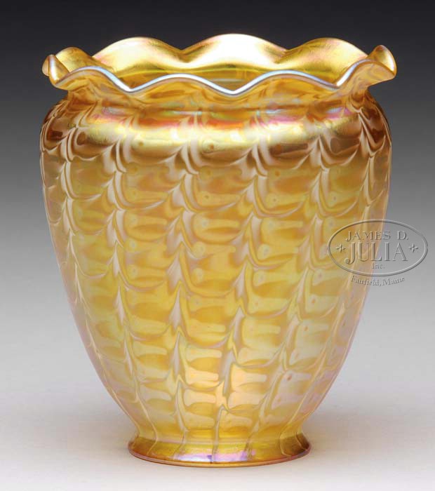 QUEZAL SNAKESKIN DECORATED ART GLASS SHADE. Nicely decorated shade in a snakeskin pattern in gold, platinum, and white on a gold ground has a beautiful magenta iridescent finish. Shade is signed on the fitter “Quezal”. SIZE: 4-3/4″ h x 2-1/4″ fitter. CONDITION: Very good to excellent. 5-68913 (300-400)