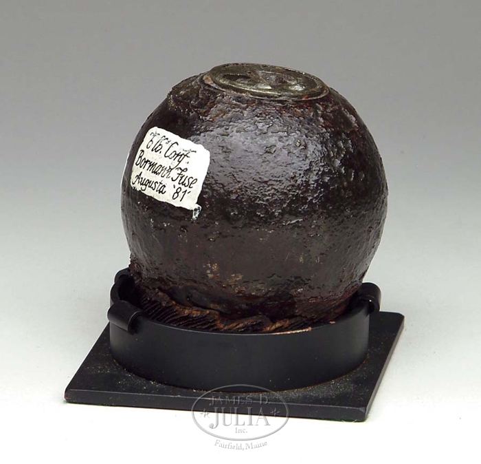 CS 6-POUNDER BORMANN FUSED CANNONBALL W/PART OF orig WOODEN SABOT. Excavated. From the site of Augusta Arsenal in Georgia. Has a disarming hole in the side. Some numbers on the fuse are legible. CONDITION: Body with light to medium ground action and sabot is poor. 4-55824 JM90 (350-450)
