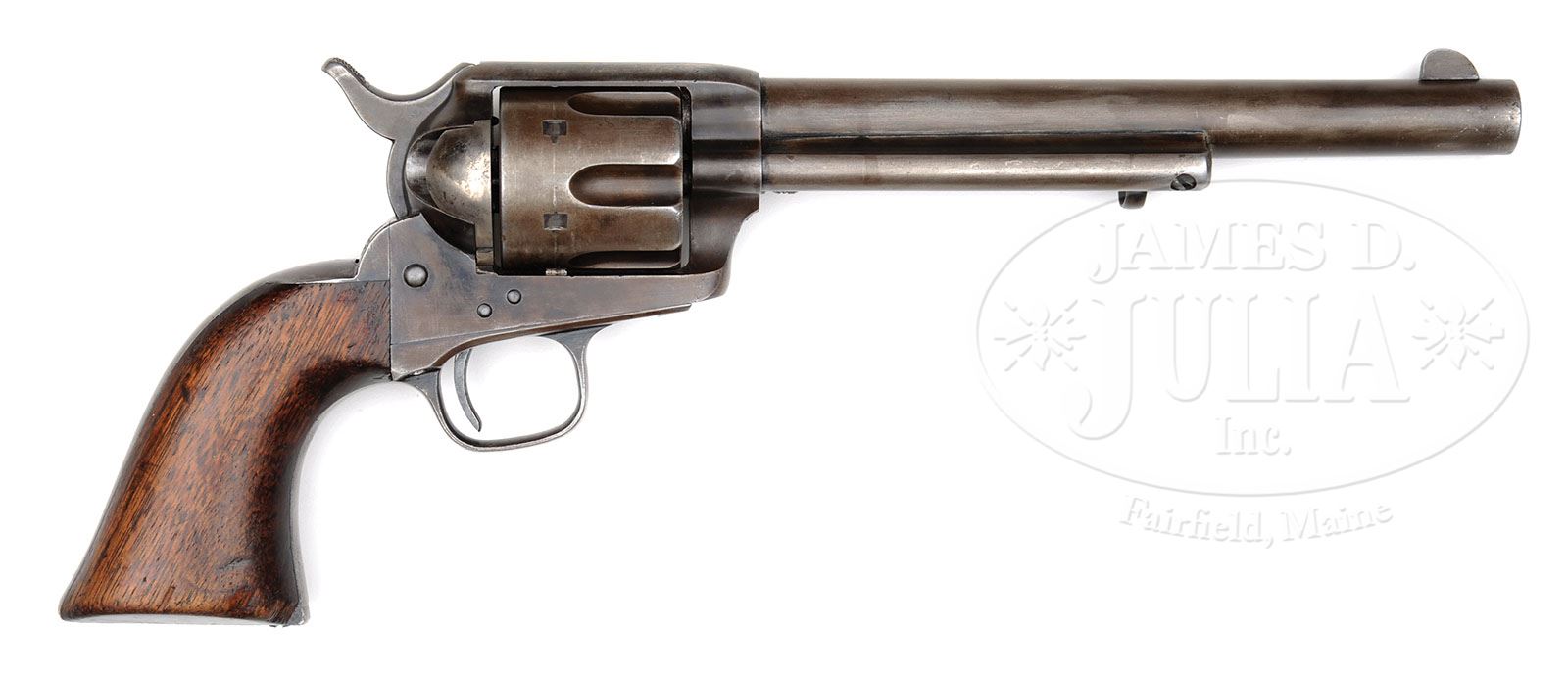 AINSWORTH INSPECTED COLT CAVALRY SINGLE ACTION ARMY REVOLVER. SN 4096. Cal. 45 Colt. Usual configuration with 7-1/2″ bbl, full front sight and 1-line script address with serifs at each end. Left side of frame has small 2-line, 2-patents and “U.S.” Mounted with 1-pc walnut grip with matching SN in backstrap channel and a partially visible cartouche on left side. Ejector housing is first type with bull’s eye ejector rod head. Various parts including bbl, cyl, backstrap and bottom left edge of the grip are also stamped with the small “A”, the initial of inspector Orville W. Ainsworth. This revolver was part of 1,000 revolvers of Lot 4 which were shipped Jan. 31, 1874 to the 2nd Cavalry stationed in Wyoming and the Rocky Mountain West and east into Kansas with outposts scattered throughout the region. They were very active in fighting the Indians including the Battle of Powder River in March 1876 and the Battle of the Rosebud in June 17, 1876, just preceding the Custer Battle of Little Big Horn. They were part of the campaign with Gen. Crook who was scheduled to link up with Custer to present an overwhelming force to convince the Indians that it would be in their best interest to return to the reservation. Instead, as history shows, Custer struck out on his own with the 7th Cavalry and was overwhelmed on June 25 & 26. The column under Gen. Crook, after the Battle of the Rosebud had retreated to regroup without being able to communicate with Custer. Later when word came to them of Custer’s massacre they advanced to the Little Big Horn and buried the dead and collected discarded & damaged weapons. The 2nd Cavalry had acquitted itself very well at the Rosebud, forcing the attacking Indians to scatter & retreat. The regiment continued to serve in the West throughout the Indian Wars and were involved in numerous fights & skirmishes well into the 1880s and later. CONDITION: Good, all matching including grip. Overall retains traces of orig finish with bright blue under the ejector housing, having been cleaned, now with a gray/brown patina; hammer retains strong case colors on the sides and rear edge; cyl is matching patina as is the grip frame. Grip has chipped toes with some battering on bottom edges, shows heavy wear and retains an old restored finish. Mechanics are crisp, bright shiny bore with a few scattered spots of pitting. 4-48795 JR352 (6,000-10,000)