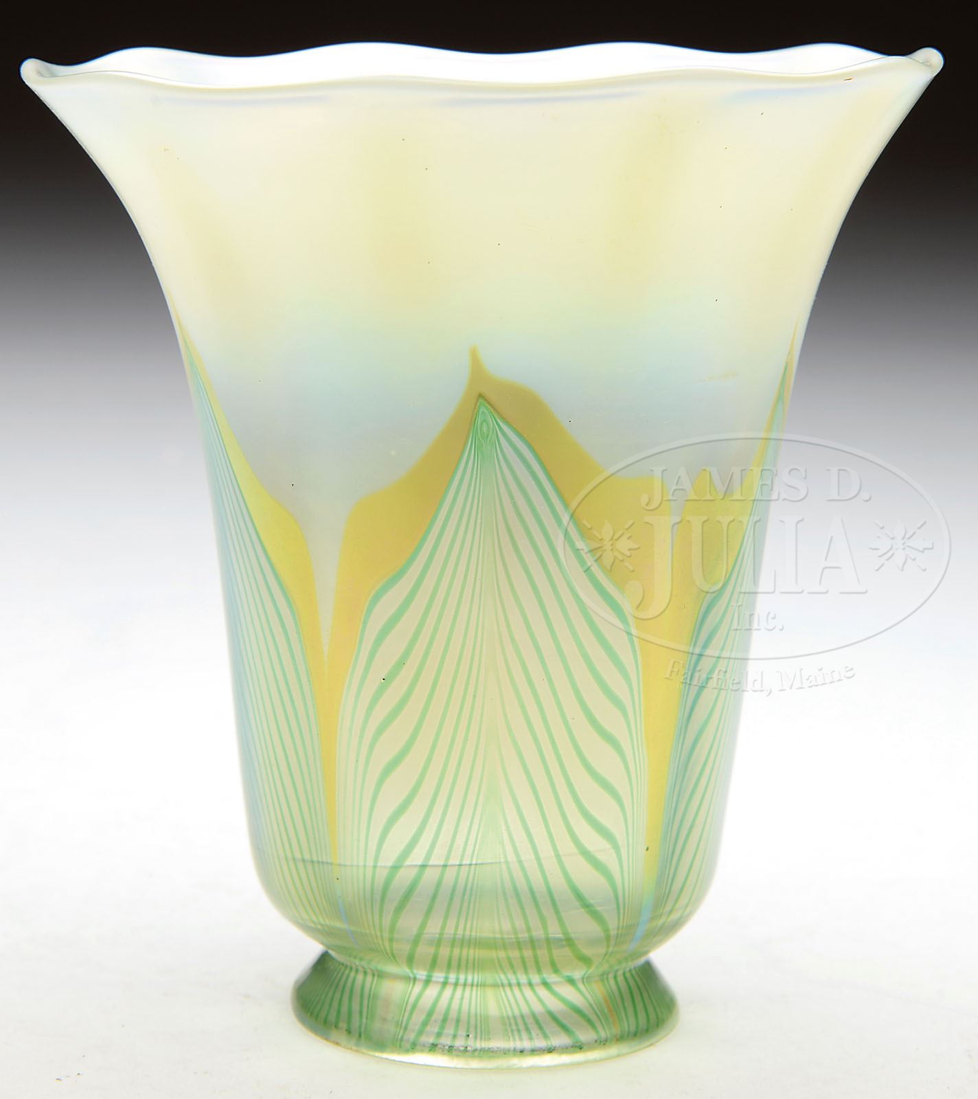 STEUBEN PULLED FEATHER SHADE. Steuben shade has green pulled feather design descending from the fitter with gold iridescent outline. Design is set against a fiery opalescent background. Signed on the fitter with silver fleur-de-lis stamp “Steuben”. SIZE: 5-3/8″ t. CONDITION: Very good to excellent. 5-67151 (300-500)