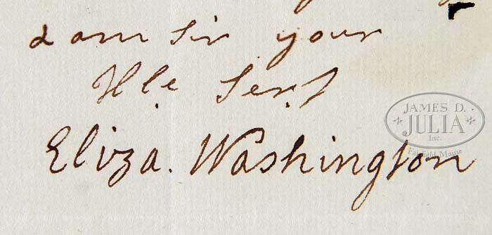 TWO LETTERS: ELIZABETH WASHINGTON TO TOBIAS LEAR, ALS 1p. 4to, September 5, 1795, AND ANOTHER WASHINGTON FAMILY MEMBER LETTER. A charming note advising Tobias Lear that “Mr. Washington” would provide him with the use of a horse named Short during his stay “up the country”. Elizabeth Washington was the only sister of George Washington to survive to adulthood. The second letter dated October 25, 1795 requests a delivery of an attached letter and signed “Lau. Washington”, presumably Laurence Washington, one of George Washington’s nephews. CONDITION: Very good condition. 9-97918-1 (300-500)
