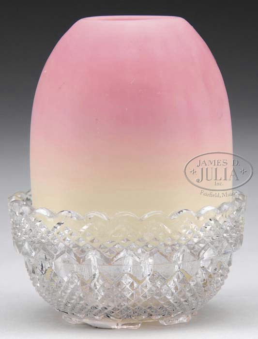 BURMESE FAIRY LAMP. Ruf Fig 19. Acid Burmese pyramid-size dome in a signed, pressed-glass crystal lamp cup. Marked, “S. Clarkes Fairy Pyramid”. SIZE: 3-5/8”. CONDITION: Very good. 5-62574 (150-250)