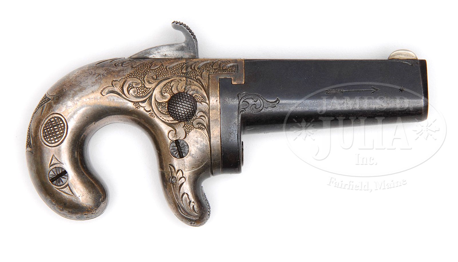 NATIONAL FIREARMS CO. BROOKLYN, N.Y. 1ST MODEL DERINGER. SN 5034. Cal.41 Short RF. The brass frame was engraved over breech in banner for presentation, which was never filled out. Standard engraving and the very rare blue bbl and silver plated frame finish. PROVENANCE: L.D. Eberhart Collection. CONDITION: Blue bbl retains 80% of blue and silver frame retains 75%+ or orig silver plate. Hammer retains 50% case color. 4-47400 DE22 (2,500-3,500)