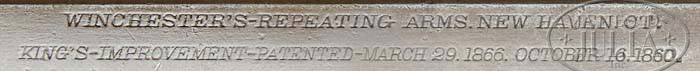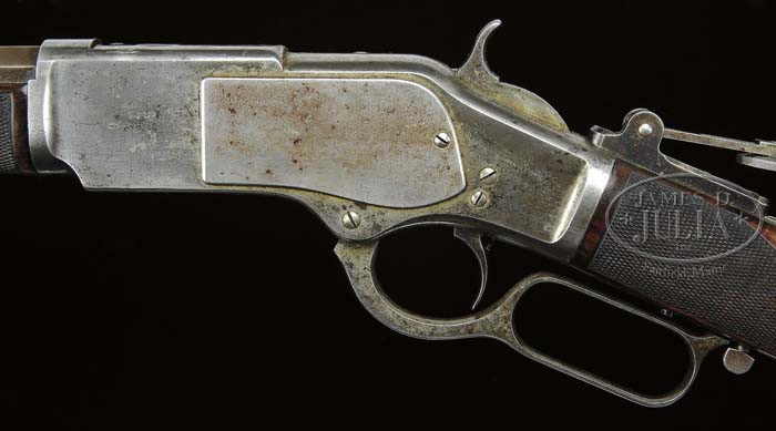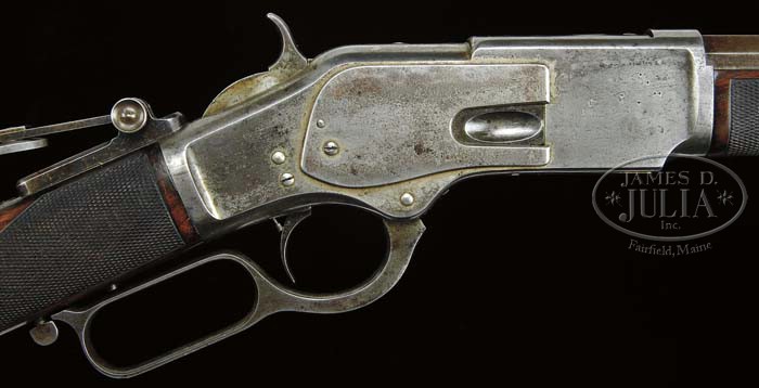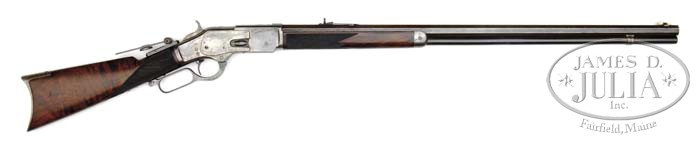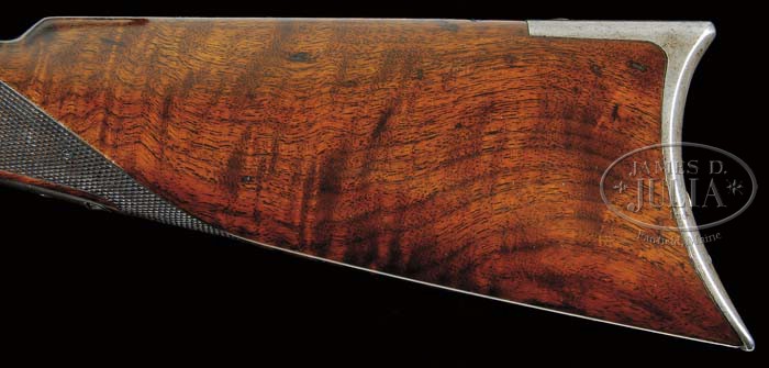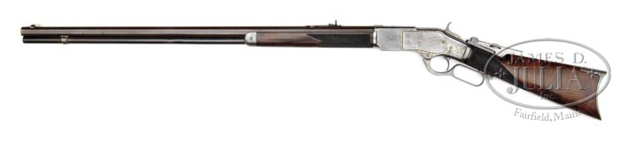 VERY RARE SPECIAL ORDER 1ST MODEL DELUXE WINCHESTER 1873. SN 25865. Cal. 44-40. 30″ oct bbl, full mag, nickel Rocky Mountain front sight, checkered side “V” notch sporting rear. Top flat of bbl marked “WINCHESTER’S-REPEATING-ARMS. NEW HAVEN. CT./KING’S-IMPROVEMENT-PATENTED-MARCH 29. 1866. OCTOBER 16. 1860.” First model receiver, mortise dust cover with checkered thumbprint, sgl set trigger, top tang with 4″ thick base sliding graduated peep sight. Mounted with nicely figured flame grain walnut, checkered straight grip, steel crescent buttplate with trap door, housing 5-piece rod with brass tip, checkered forend with nosecap. Accompanied with Cody Museum Firearms fact sheet identifying as 30″ oct bbl rifle, set trigger, checkered stock, case hardened, received in warehouse 3-13-1877, shipped from warehouse 3-16-1877 on Order No. 8556. Inspection of lower tang reveals Assembly No. XX296, with matching 296 in top tang channel of stock and inside toe of buttplate. CONDITION: Fine. Bbl retains an even medium brown patina with several minor nicks & scratches and some minor spots of shallow surface oxidation. Mag tube is a dark brown patina with some minor scratches, and a small area that appears to be a raised dent showing some minor peen marks. Receiver retains a silver hardening with wear blending with a gray patina normal minor nicks & scratches. Stock is sound with nicely refreshed checkering, some minor nicks, dings & scratches and retains a hand rubbed oil finish. Forend is sound with nicely refreshed checkering, some minor nicks & dings & retains a hand rubbed oil finish. Nosecap has flaked to a silver patina. Mechanics are crisp, including set trigger, bore has distinct rifling with some shallow pitting. 4-41124 BDT65 (16,000-22,000)