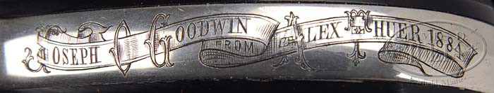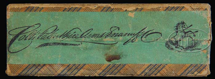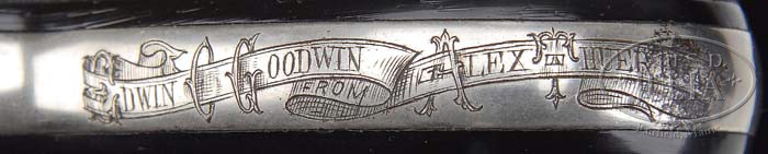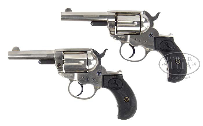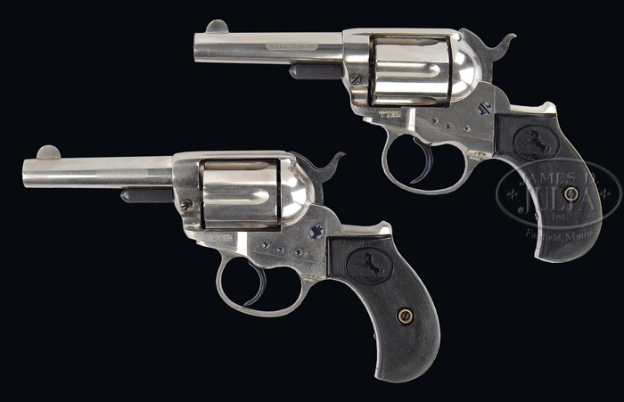 EXTREMELY RARE PAIR OF PRESENTATION COLT MODEL 1877 DA LIGHTNING SHERIFF’S MODEL REVOLVERS. SN 48967 and 48989. Cal. 38 Colt. Both revolvers are identical with nickel finish, 3-1/2″ bbls, full half-moon front sights, 2-line bbl addresses & etched panels “COLT D.A. 38” on the left sides. Left sides of the frames have 3-line patent dates with caliber markings on the left rear webs of the trigger guards. Both have rampant Colt hard rubber grips, matching numbered in pencil on the insides. The back straps are beautifully inscribed in block letters with Gothic capitals on ribbons “Joseph O. Goodwin FROM ALEX THUER 1884”. Joseph O. Goodwin was born in 1843 in East Hartford, Connecticut, where he resided until his death in 1923 on land that his family had settled in 1697. He was educated in East Hartford schools and later in a private school. He worked at his family’s general store business & post office which he left in 1862 to learn the printing business in Hartford until 1871. At that time he left the printing business to work with his brother and devoted his spare time to writing. In 1874 he was elected town clerk which position he held until his death, a period of more than 48 years. He was involved in politics and for a while in 1878 was state representative to the Connecticut General Assembly. He was deeply involved in local politics and was directly responsible for the founding of the East Hartford High School and for later school consolidation. From 1879-1921 he was secretary of the school board and for many of those years was chairman of the high school committee. In 1879 he published a 250-page history of East Hartford entitled East Hartford, Its History and Traditions. He was also one of the publishers of East Hartford’s first newspaper The Elm Leaf. He also contributed articles to Harper’s Magazine and other periodicals. In addition, he was requested to and wrote Memorial History of Hartford County. ¶ Accompanied by 2 Colt factory letters for these 2 revolvers fully identifying them with nickel finish and type of stocks not listed, with shipment to A. Thuer, address “COLT PATENT FIREARMS CO.”, on March 22, 1884, in a shipment of 2 same-type arms. Under the remarks section it is noted that “Alexander Thuer was the designer of the first metallic cartridge system available commercially on Colt revolvers.” Also accompanied by numerous excerpts of publications regarding the Goodwin family, and other publications wherein Joseph Goodwin is mentioned, along with a memoriam of Joseph O. Goodwin. Additionally accompanied by 2 boxes of 38 Colt ammunition: 1) Union Metallic Cartridge Company, 38 long, 2-pc sealed box with a picture of a Lightning revolver on top, green label with black lettering & black line drawing with green band on a plaid body. Band has the usual lettering on one side & end with the other side printed in script “Colt Patent Fire Arms Manuf Co” and a line drawing of the rampant Colt; 2) Full open box of Winchester 38 short, 2-pc box with buff-colored label, probably faded from yellow, with black lettering & an orange band with kraft-colored 2-pc box. PROVENANCE: Dr. Joseph A. Murphy Collection. CONDITION: Both revolvers are exceptionally fine, with both retaining about all of their orig finish, with some slight flaking on the right front side of the frame on No. 48967 and a line of pitting on the cylinder & loading gate of No. 48989. The etched panels on both are crisp & clear, and the grips are all exceptionally fine, showing little or no wear. The screws, triggers & hammers retain about all of their orig factory fire-blue. Mechanics are crisp, bright shiny bores. A truly exceptional & rare pair of Lightning revolvers, never to be encountered again. Ammunition: 1) Very fine plus, label & band are completely intact with minor chips & light soil; 2) Fine, top label moderately faded with some minor water staining, completely intact, band around the sides is open but intact, ammunition is fine. 4-36423 JR75 (30,000-50,000)