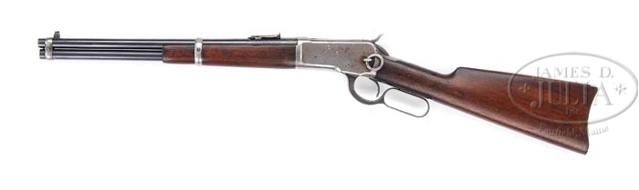 *WINCHESTER 1892 16″ TRAPPER. SN 697613. Cal. 44 WCF. 16″ rnd bbl, full mag, square base with pinned blade front sight, standard carbine ladder rear sight. Left side of bbl is marked “MODEL 92-WINCHESTER-44W.C.F./TRADEMARK”, with Winchester proof marks top of bbl and adjacent top of receiver. Standard receiver with staple and ring on left side. Mounted with straight grain walnut, steel carbine buttplate, 7-7/8″ forend with band. CONDITION: Fine. Bbl and mag tube retain 90% orig blue with some minor scratching and normal nicks & dings. Both bbl bands have flaked to a silver patina. Receiver has flaked to a silver patina mixed with some brown spotting, with normal minor nicks & scratches. Hammer and lever retain a gray & silver patina. Stock is sound with some minor nicks & dings and retains a fine open grain oil finish. Forend is sound with some minor nicks, dings & scratches a hairline grain crack forward of band and retains a dark open grain oil finish. Mechanics are crisp with a bright shiny bore. 4-38351 BDT348 (5,000-7,000)