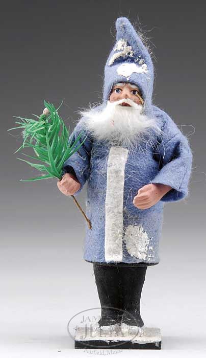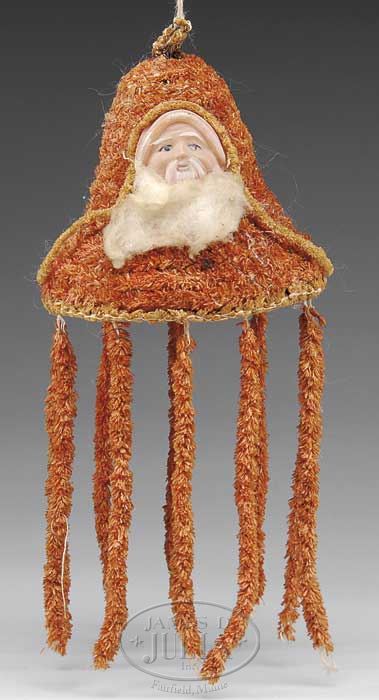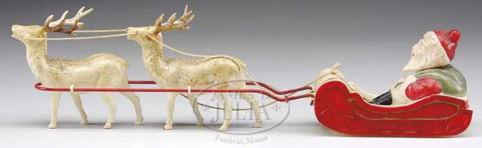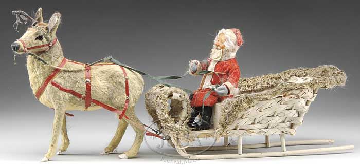 INTERESTING LOT OF CHRISTMAS DECORATIONS. Lot includes 1) 15″ moss covered woven straw sleigh carrying a composition headed benevolent Santa. Sleigh also includes two miniature gift boxes with Victorian paper “scrap” covers. Sleigh is pulled by a cloth over wood reindeer with leather strappings. Figure has glass eyes and and lead antler (one antler missing). General soiling. 2) All celluloid Japanese Santa in sleigh pulled by two reindeer. 3) Very nice German composition Christmas Belsnickel candy container. Hand painted figure holds feather tree. Excellent condition. 4) A later standing Santa-wooden base. Composition body holding feather tree. 5) Two chenille decorated bells with composition images of Santa. 6) Jacob’s English biscuit tin showing Santa and children. 7) British Harvino toffee candy tin with lithographed images of Santa with sack of toys. SIZE: Sleigh and reindeer are 24″ l. PROVENANCE: Barbara J. Thornsjo Estate, Albion, Maine. CONDITION: Overall good unless noted above. 1-10745 (300-500) Auction: Advertising, Toy & Doll - Spring 2011 Please Note: All prices include the hammer price plus the buyer’s premium, which is paid by the buyer as part of the purchase price. The prices noted here after the auction are considered unofficial and do not become official until after the 46th day. |