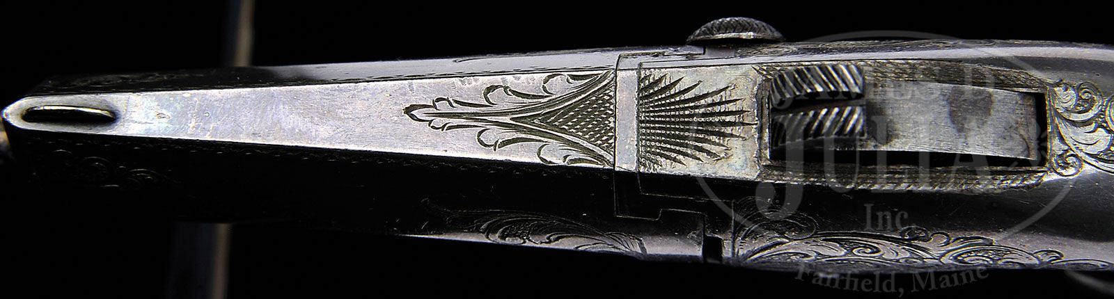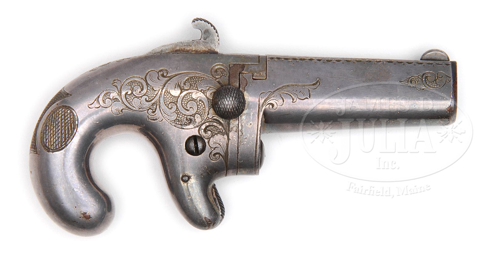 NATIONAL FIREARMS CO. BROOKLYN, N.Y. 1ST MODEL DERINGER. SN NSN. Cal.41 Short RF. 2-1/2″ bbl Rare iron frame 1st Model. Gun has 20% extra engraving over top of breech and rear end of bbl flat as well as a border around and behind hammer with extra chasing outlining the bbl flat on each side. No company legend on top of bbl flat due to extra engraving. PROVENANCE: L.D. Eberhart Collection. CONDITION: Gun is silver plated overall retains at least 90%+. Hammer retains portions of orig case color. 1st Model National iron frames are rarely seen in this fine a condition. 4-47402 DE24 (2,000-3,000)