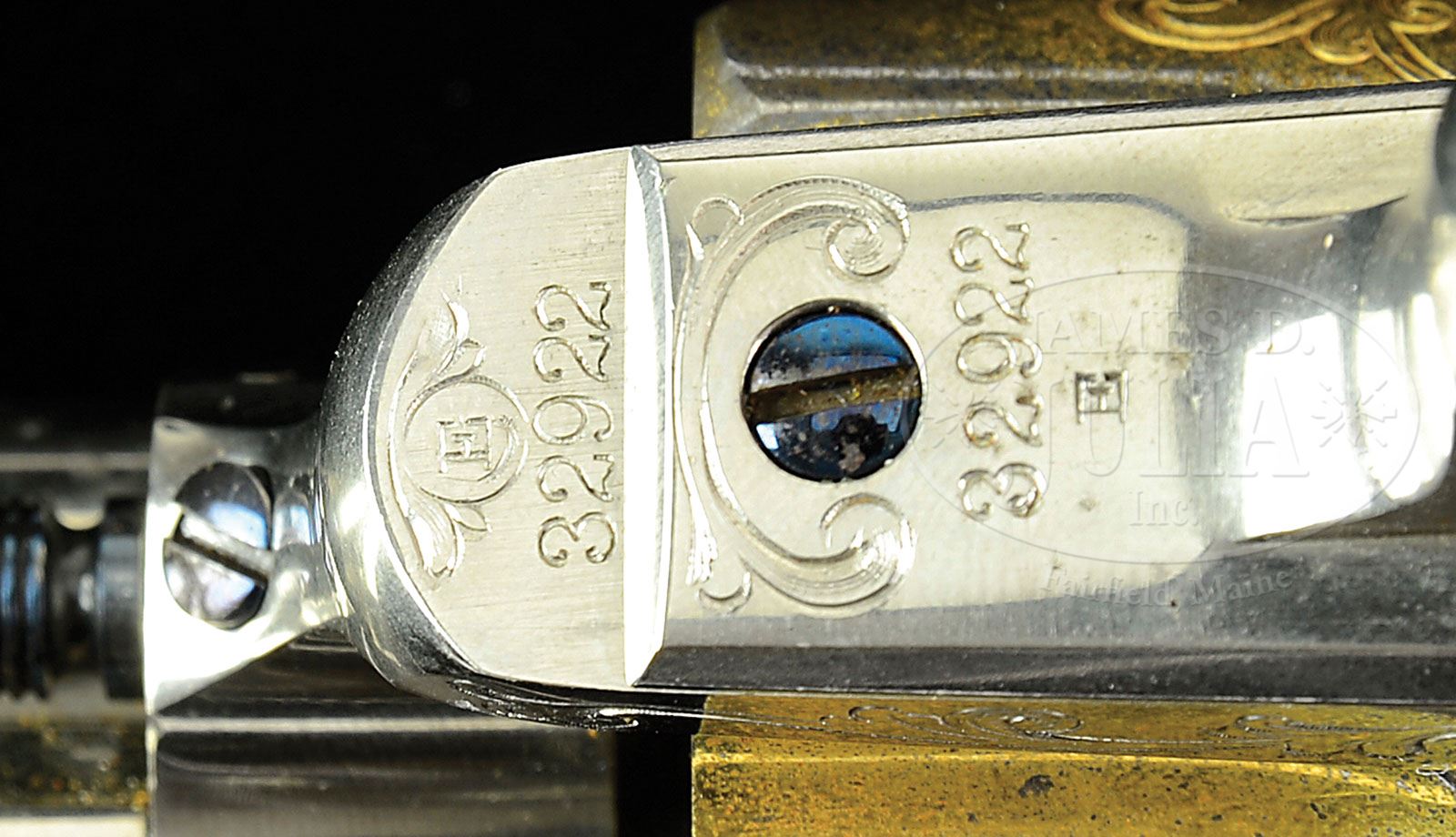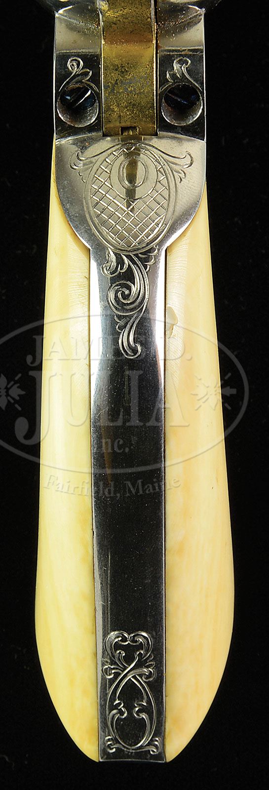 RECENTLY DISCOVERED EXTREMELY RARE ENGRAVED NICKEL & GOLD COLT SINGLE ACTION ARMY REVOLVER. SN 32922. Cal. 45 Colt. Nickel & gold finish with 7-1/2″ bbl, full front sight and 1-line block letter address. Left side of frame has small 2-line patent dates and caliber marking on left rear web of trigger guard. Mounted with 1-pc smooth ivory grip. Revolver appears to have been manufactured in late 1876 and was engraved by Eugene Young in his minimalist style similar to engraving on two other important gold & nickel revolvers sold by Julia’s in the recent past. Bbl, frame, trigger guard & back strap are nickel finish while the cyl, hammer, trigger & front sight are gold washed. All screws are fire blued. SN is found on bottom of frame, trigger guard & buttstrap, which are all accompanied by a small “E” which indicates that this revolver was destined for factory engraving. Last four digits of matching SN are found on the cyl & bottom of bbl under ejector housing. Engraving consists of light coverage on frame, recoil shield, loading gate, bbl, ejector housing, cyl, back strap, butt strap & trigger guard. Top of back strap, back of hammer slot is engraved in an oval pattern with cross hatching and a similar pattern on each side of the hammer nose with foliate arabesque patterns on sides of shank & hammer spur. Accompanied by a Colt factory letter identifying this revolver in caliber 45 Colt, bbl length not listed, nickel with gold cyl, hammer, trigger & screws, type of stocks not listed, factory engraved & shipped to B. Kittredge & Co., Cincinnati, OH, on Dec. 18, 1878 in a 20-gun shipment. It is apparent that the gold screws mentioned are either a data entry mistake in the records or a transcription mistake when the letter was printed. Screws are all fire blued but it has a gold sight which is probably what the orig entry was supposed to be. Also accompanied by a notarized statement dated July 10, 2009 over the signature of George R. Dullnig, wherein he states that this revolver, identified by SN, “Has been in our family since a few years after the 1776-1876 Centennial celebration.” In the next paragraph he states “My grandfather, Richard E. Rolle, wanted one of the beautiful guns of Colt’s centennial wheel display. He purchased the gun from the Colt Manufacturing Co. for, I’m told, around thirty plus dollars which he considered a significant amount of money, although he owned a successful clothing company.” He goes on that his family moved from Philadelphia to Houston, TX and left this revolver to his father, George E. Dullnig, who then bequeathed it to George R. Dullnig. Mr. Dullnig’s statement above corresponds with the probably date of manufacture of this revolver which appears to have been late 1876, probably too late for the 1876 exposition but would correspond with an order generated from the 1876 expo. This revolver is nearly identically engraved to two other Single Actions previously sold by Julia’s, SNs 47135 & 48206, which were both manufactured in 1878 and absolutely engraved by the same hand. They also had fully engraved hammer shanks & spurs with slightly different motifs. Information provided by the consignor of #47135 states that the combination of nickel & gold was originated by collaboration between Colt and well known Colt dealer J.P. Lower of Denver, Colorado, who was in business in the 1870s and was a major Colt sales outlet. SN 48206 was also shipped to B. Kittredge & Co. The style of engraving found on this revolver is unlike any other known master engravers at Colt, although it has stylistic similarities to some of the engraving by Oscar & Eugene Young at Smith & Wesson. Very few Eugene Young engraved Colts are known and when encountered are probably not recognized for their simple beauty. Also accompanied by a 6-page letter from renowned Colt authority & author, Ron Graham, wherein he authenticates this revolver as being absolutely real & original and states that it was “factory assembled, engraved and finished expressly to be one of Colt’s exhibition firearms”. He also states that these revolvers “were displayed at centennial exhibits, world fairs, state fairs, distributor marketing promotions—for many years”. He states that after examining and studying many engraved Colts he speculates that this revolver was engraved in the Cuno Helfricht shop and the engraver may have been influenced by master engraver, Gustave Young, or his immediate family who were also master craftsmen. He additionally states that “During the entire first-run Single Action production, only three ‘A’ style, factory embellished, SA revolvers are known that have nearly full hammer coverage.” He further states “As of this writing there are only two known first-run SAs having factory gold plated front sights.” Additionally accompanied by a letter on Cullity & Son letterhead over the signature of Daniel Cullity. Mr. Cullity is a renowned restoration artist for all things firearm, a former master engraver at Colt and recognized authority on Colt firearms. He authenticates this revolver as being “genuine in every respect including the grips.” He states “It is unfired, and it had no indications that it had ever been disassembled.” He also states that it has never been refinished. He additionally states that “The elegant engraving is identical in style and execution with other Colt revolvers that are believed to have been engraved for the Philadelphia Centennial Exhibit of 1876.” He further states “This pistol may have been on the ‘wheel’ display.” We however have no proof of this gun being in the exhibition and so cannot affirm Mr. Cullity’s statement, however it is the most compelling documentation for a wheel gun we have seen. This is an extraordinary Colt Single Action in astounding orig condition with engraving patterns known on only a very few, very rare Colts from that era. PROVENANCE: Richard E. Rolle & descendants. CONDITION: Extr