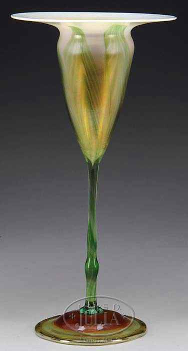 TIFFANY FLOWER FORM VASE. Very nice Tiffany flower form vase has delicate green stem leading to a green pulled feather design which extends up the bowl onto the underside of the large flat rim. Pulled feather design is done against a creamy white background. Signed on the underside of the rolled foot “L.C. Tiffany-Favrile 7096” also near the pontil “L.C.T.”. SIZE: 12″ h. CONDITION: Very good to excellent. 5-67852 (10,000-15,000)
