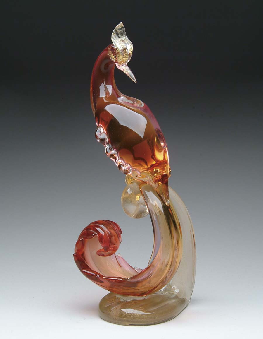 VENETIAN BIRD FIGURINE. Impressive figurine depicts exotic bird in pink and amber glass with long curling tail resting atop a ribbed swirled pedestal of clear glass with gold inclusions. SIZE: 14-1/2 in. t. CONDITION: Very good to excellent. 5-61229 (500-700)