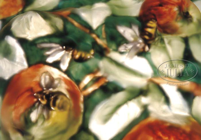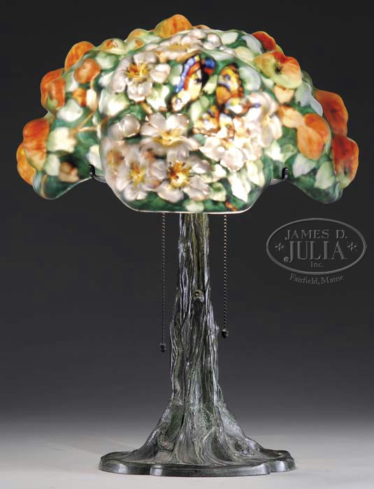 PAIRPOINT PUFFY APPLE TREE LAMP. Outstanding Pairpoint puffy lamp in the apple tree pattern has beautifully painted shade with multicolored butterflies, pink and white apple blossoms, black and yellow bumble bees and apples in various levels of ripeness. All against a rich green leaf background. Shade is marked “The Pairpoint”. This wonderful shade sets on a tree trunk base with green highlighted patina, two socket cluster and four arm spider. Base is signed on the underside “Pairpoint Mfg. Co.” and “P” in a diamond and style number “3091”. SIZE: Shade is 15″ dia. Lamp is 21″ t. CONDITION: Very good to excellent. 5-61581 (20,000-30,000)