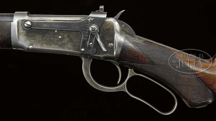 WINCHESTER MODEL 1894 DELUXE RIFLE WITH RARE SHORTER THAN STANDARD BARREL. SN 28471. Cal. 30 WCF. 24″ rnd bbl, Lyman #38 wind gauge receiver sight, filler in rear dovetail, and Lyman #3 front sight, 1/2 mag. Style “H” checkered pistol grip stock and forearm of fine “XXX” walnut having a steel shotgun butt, and hard rubber grip cap. Gun is accompanied by a Cody Firearms Museum fact sheet stating rifle, caliber 30, bbl shape rnd, bbl length 22″, trigger plain, 1/2 mag, The fact sheet further shows shipped 10-27-1897, returned for R&R, 11-20-99, other information stating “Black”. The fact sheet discrepancy in bbl length is most likely a clerical error as the 24″ bbl bears correct 1897 markings. CONDITION: Very Good. Bbl has 70-80% orig blue with some fading in the breech area. Receiver has 25-35% blue in the protected areas fading to a silvery patina with spots of light pitting on the sides. Hammer and lever have traces of case colors. Sound stock and forearm showing light checkering wear and having much orig finish w/light scratches and handling marks. Sound mechanics. Bright bore has strong rifling with some darkening in grooves. 4-40356 DS7 (3,000-5,000)