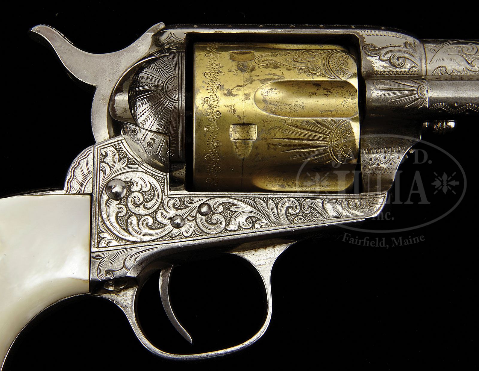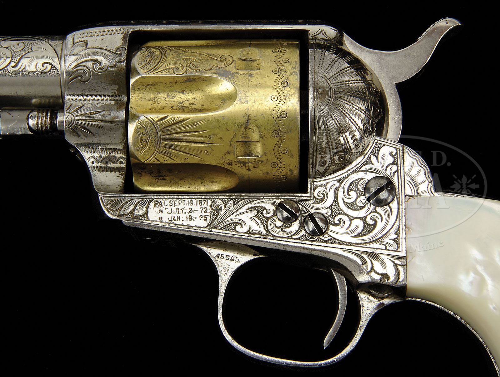 FINE HELFRICHT ENGRAVED SINGLE ACTION ARMY REVOLVER. SN 126414. Cal. 45 Colt. Nickel finish with 7-1/2″ bbl, full front sight and 1-line block letter address. Left side of frame has 3-line patent dates and caliber marking is on left front web of trigger guard. Mounted with smooth 2-pc pearl grips. Revolver is beautifully engraved by master engraver Cuno Helfricht with full coverage on the frame consisting of foliate arabesque patterns on sides, sunbursts on recoil shield & loading gate with small sunbursts on each side of the ejector boss and cyl pin boss. Bottom front frame gullets have zig zag and snake & dot patterns. Top strap is engraved in snake & dot patterns with extensive foliate arabesque patterns over both sides of bbl and around front sight at the muzzle. Ejector housing is engraved with snake & dot patterns in the top gullet & outer radius. Cyl is engraved with Mr. Helfricht’s distinctive alternating sunburst and foliate arabesque patterns on the lands between the flutes and has a snake & dot border around rear edge. Cyl is gold plated. Top of backstrap has Mr. Helfricht’s distinctive fan pattern with geometric patterns down backstrap, on buttstrap & trigger bow. Accompanied by a Colt factory letter identifying this revolver in caliber 45 Colt with 7-1/2″ bbl, nickel finish with gilt cyl, type of stocks not listed, factory engraved and shipped to E.C. Meacham Arms Co., St. Louis, MO on June 28, 1888 in a 1-gun shipment. Under remarks the company reports that there is another revolver with the same SN listed as caliber 44-40 with 7-1/2″ bbl, nickel finish & rubber stocks shipped to the San Francisco Agency on May 31, 1888. CONDITION: Very fine to extremely fine. Bbl, frame & ejector housing retain virtually all of their strong orig nickel finish with some slight sharp edge & high point losses; trigger guard & buttstrap retain most of their strong orig nickel with some fine flaking on the front strap; backstrap is a gray metal patina; cyl retains about 93-95% gold plating. Grips are sound with great fire & color. Mechanics are fine, bright shiny bore. 4-48350 (35,000-40,000)