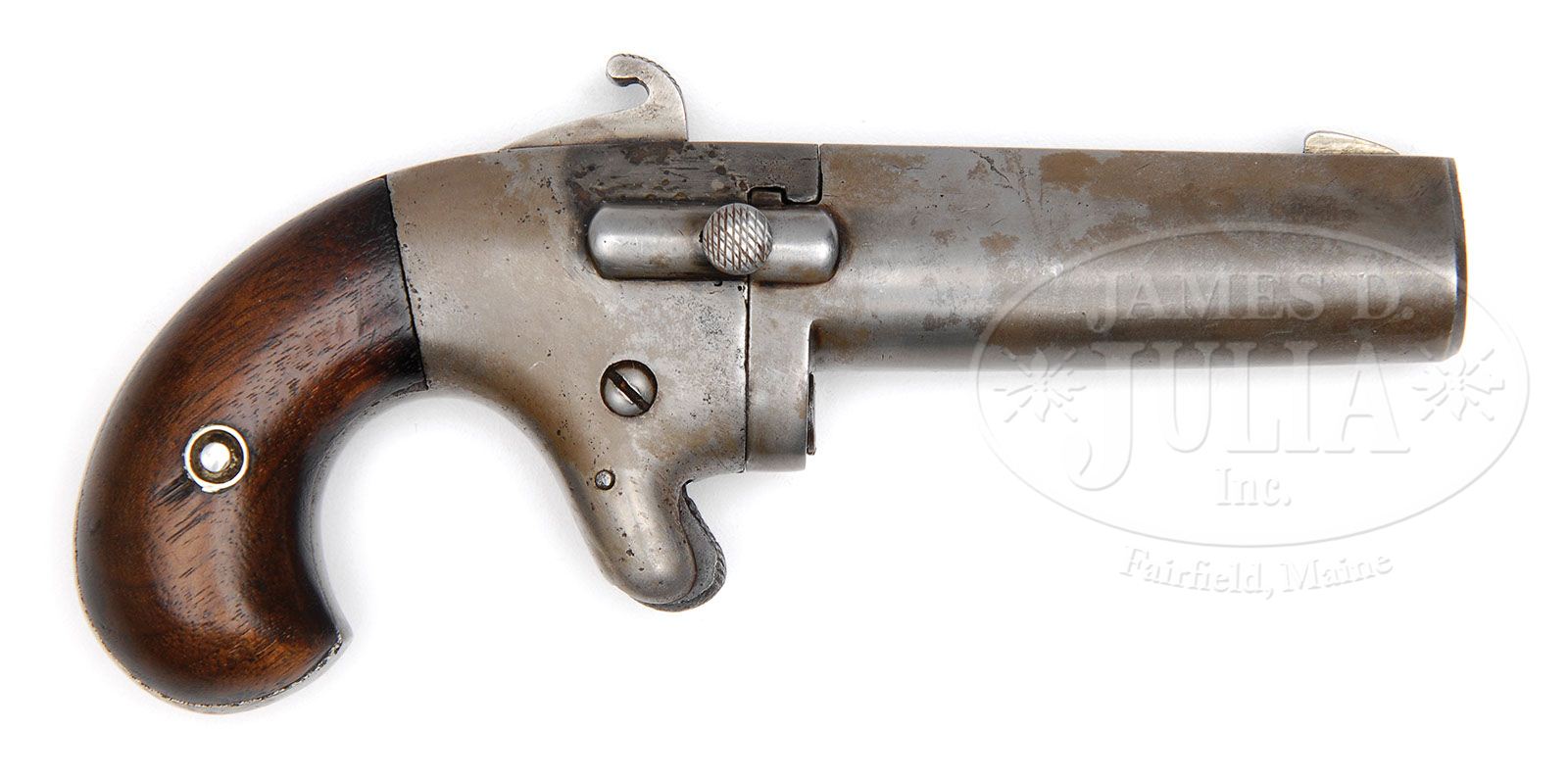 NATIONAL FIREARMS CO. PROTOTYPE DERINGER. SN C763. Cal. 52 Short RF. Unmarked except for the SN stamped on the frame under the grips. This experimental piece was finished in the white. It has an oversized bbl and much stronger locking latch because it was made for it. Note the loading port to help accommodate the oversized cartridge. Both gun and cartridge are unique and were never put into production. The cartridge is .52 cal. RF short designed especially for this gun. This piece turned up at Harry Mann’s Shooting Gallery on Main Street in Old Downtown Las Vegas, circa 1938. It was accompanied by the shell shown here, which is the only one known in .52 Short RF. That shell accompanies the gun. The fact that it is stamped on the frame, with the SN C763 indicated that a shop mechanic took a standard frame off the production line. then perhaps tried to create a more powerful Second model. There are no other examples and no patent papers, etc…, probably means that ownership-management did not think it was a good idea or cost effective. No one knows for sure. PROVENANCE: Harry Mann Collection, L.D. Eberhart Collection. CONDITION: Gun is a bench model and as such is finished in the white. 4-47408 DE30 (2,500-3,500)