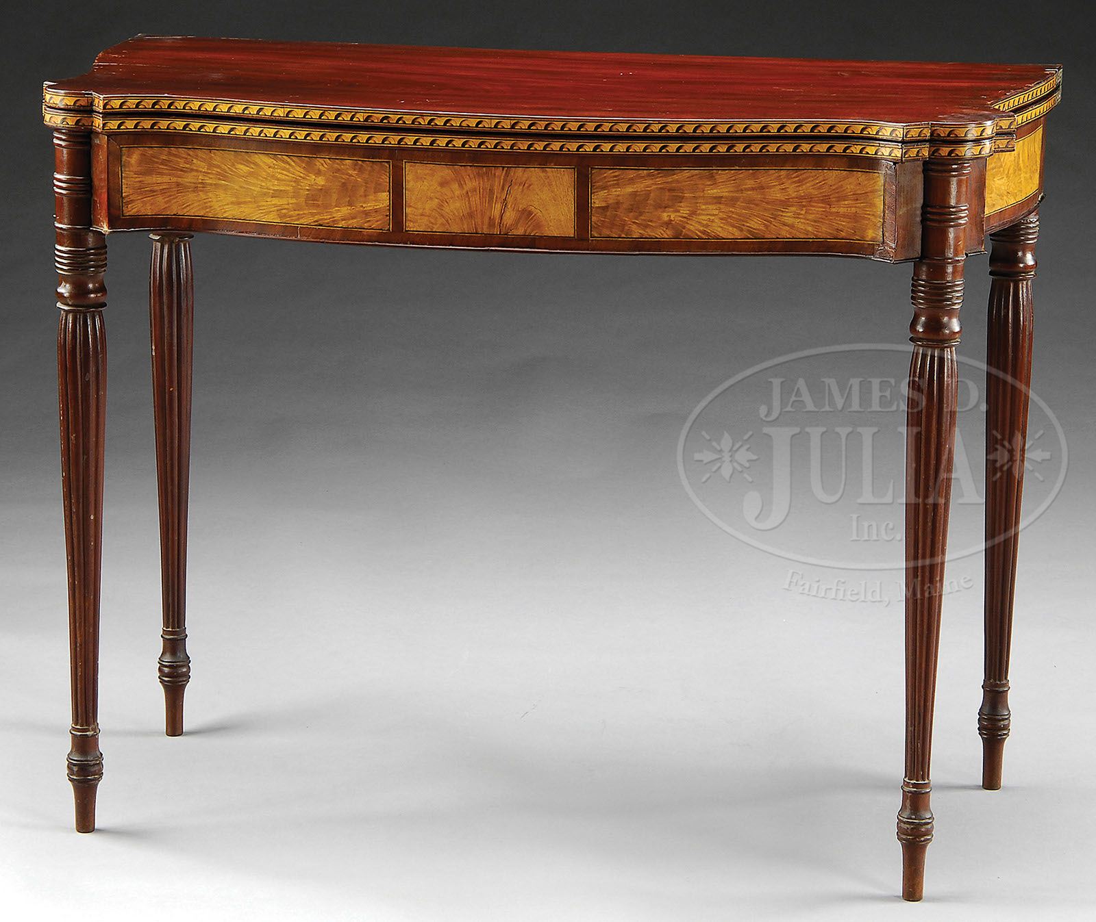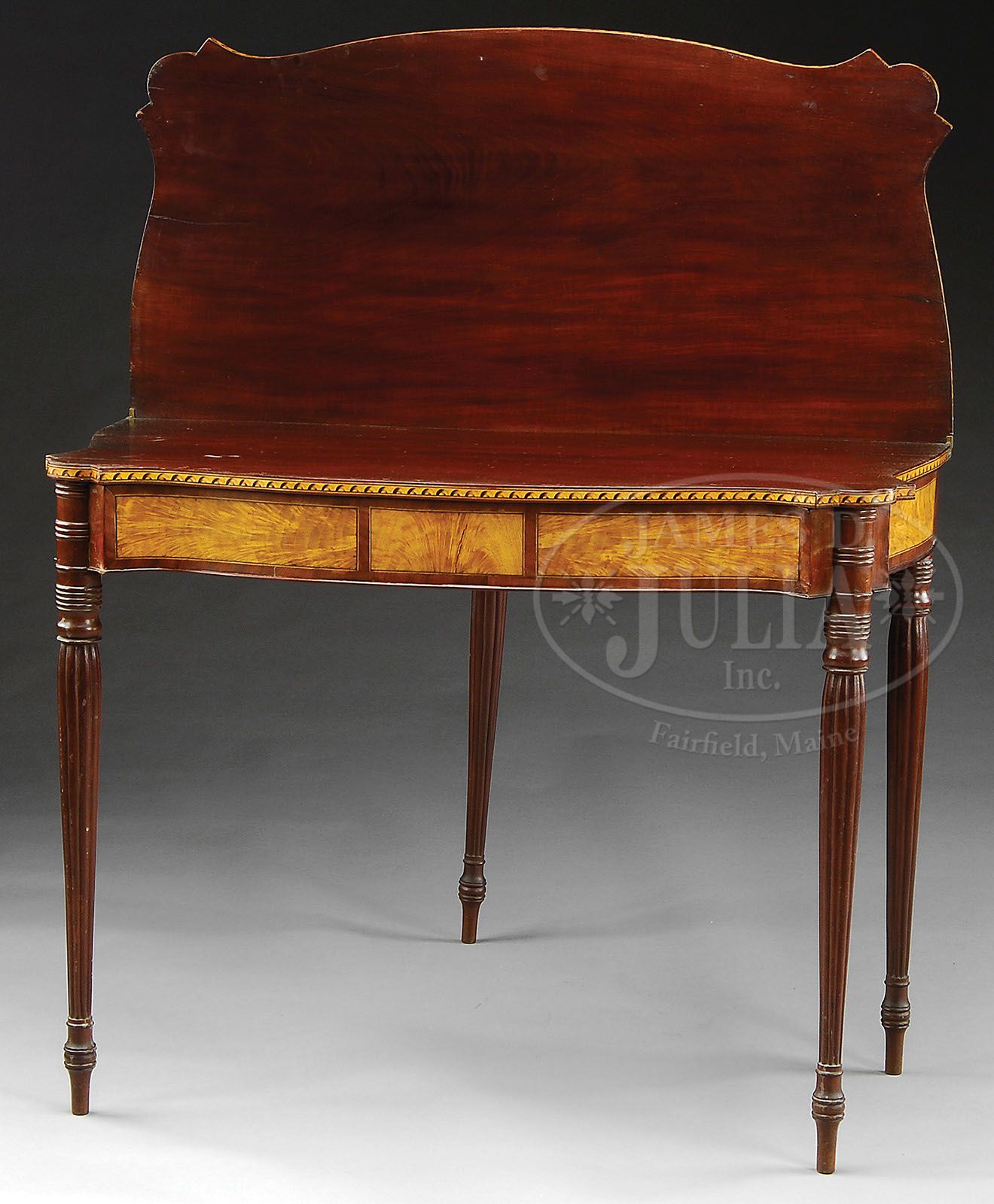 FINE FEDERAL MAHOGANY AND SATINWOOD CARD TABLE. Circa 1810, Boston or North Shore, Massachusetts. The rectangular hinged top with half serpentine ends, ovolo corners, and serpentine front. The edges with lunette inlays in the manner of the Seymour shop, above a conforming frieze with satinwood inlaid figural panels. The corners with engaged half round ring-turned colonnettes continuing to ring-turned tapering reeded cylindrical legs with ring-turned swelled cuffs, continuing to tapered feet. SIZE: 28-1/4″ h x 36-1/2″ l x 17-1/2″ d. CONDITION: Professionally re-polished with restoration at rear corners of top at hinges, and with cosmetic restoration of legs at juncture of apron. Otherwise very good. 9-27678 (4,500-6,500)