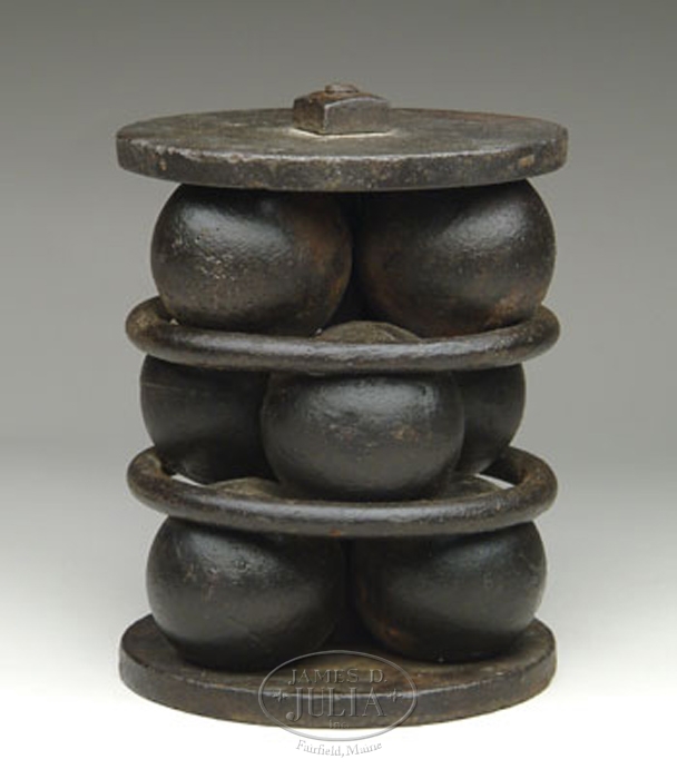 US 32-POUNDER STAND OF GRAPE. Excavated. Having nine iron balls surrounded by two rings and the top and bottom plate and center bolt. Has never been disassembled – 100% orig. Extremely nice condition. CONDITION: Very fine to excellent. 4-55835 JM137 (1,500-2,500)