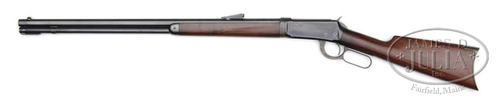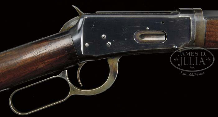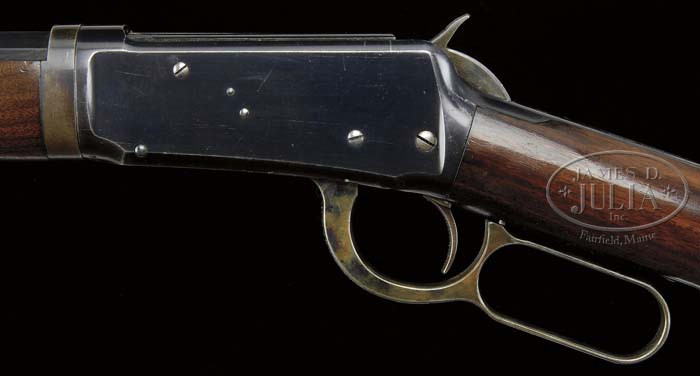 *WINCHESTER 1894 TAKEDOWN RIFLE. SN 267164. Cal. 32 Winchester Special. 26″ oct bbl with smokeless powder rear sight, and sporting front sight, full mag, crescent buttplate. CONDITION: Very good. 90% bbl and magazine tube blue with slight edgewear and a few very fine nicks. Receiver has 80-85% blue blending to patina on lower edges and front ring. Takedown collar has some blue blending with a smooth patina. Lever and hammer show 30-40% case coloring, crescent steel buttplate has traces of case coloring fading to a silver patina with spots of white corrosion. Sound stock and forearm with orig finish, showing oil darkening in the wrist area, numerous light to moderate scratches and handling marks are present. Mechanics are crisp, takedown is tight, bore is bright with sharp rifling. 4-42094 DS4 (2,500-4,000)