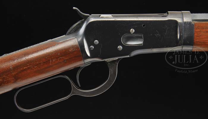 *WINCHESTER SPECIAL ORDER 1892 TAKEDOWN LEVER ACTION RIFLE. SN 834384. Cal. 25-20. 24-1/4″ half rnd, half oct bbl, full mag takedown, silver bead front sight with set screw, flat top V-notch sporting rear, usual bbl markings. Standard receiver mounted with nicely figured straight grain walnut, straight grip, crescent steel buttplate, standard forend with nose cap. CONDITION: Very fine. Bbl retains 95-98% orig blue, some minor muzzle wear, a couple of small nicks and dings and tiny scratches. Mag tube has 95% orig blue with some thinning from takedown. Receiver retains 95% orig blue, thinning at sharp edges, some small flaking blending with brown patina and normal nicks and scratches. Hammer retains orig blue that is showing bright on both sides, lever has orig blue with some minor flaking and blending with brown patina. Stock is sound with some minor nicks, dings and scratches and retains most of its orig finish. Buttplate shows flaking orig blue blending with brown patina. Forend is sound with normal nicks and dings and fine scratches and retains orig finish blending with hand worn patina. Nose cap has orig blue with some flaking, blending with brown patina. Mechanics are crisp with a nice shiny bore. 4-38789 BDT324 (6,500-9,500)