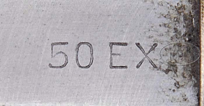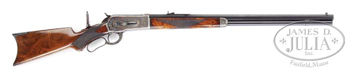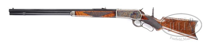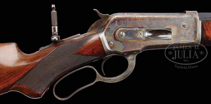 OUTSTANDING DELUXE WINCHESTER 1886 EXPRESS LEVER ACTION RIFLE. SN 85483. Cal. 50EX. 26″ oct bbl., full magazine, silver bead front sight, marked “PAT. NOV. 4, 02”, with set screw, serrated side sporting rear sight with set screw. Standard bbl markings on top flat “MANUFACTURED BY THE/WINCHESTER REPEATING ARMS CO.NEW HAVEN CONN.U.S.A.” and “50EX” adjacent to receiver. Standard receiver with tang mounted peep sight. “XX” walnut stock with checkered pistol grip, ebony insert in grip cap, crescent steel buttplate, “H” style checkered forend and nosecap. Inspection of lower tang reveals assembly no. “241XX” and matching number can be found in top tang channel of stock and inside toe of buttplate. Accompanying gun is a Cody Firearms Museum Winchester letter identifying as a 50-110 rifle, oct bbl, plain trigger, checkered stock, pistol grip, Lyman front and rear sights, received in warehouse January 23, 1894, shipped from warehouse January 23, 1894 on Order No. 7507. CONDITION: Very fine. Bbl and mag tube retain 95-97% orig blue with some minor muzzle wear and slight thinning on sharp edges and a few typical minor nicks & scratches. Receiver retains 75-80% orig case colors, strong on rear portion of both sides, thinning in forward portion and slightly silvering mixed with brown patina across bottom, right side is mixed with a few minor spots of brown patina. Hammer shows dark orig case coloring with some minor silvering on left side. Lever shows traces of orig color in protected area with balanced blending with a silver patina. Stock is sound, good checkering with a few minor flattened points, typical nicks, dings & light scratches, retaining much of its orig piano varnish finish. Buttplate has toned to a gray patina. Forend is sound with good checkering, a few minor flattened points, usual nicks & dings, and retains orig piano varnish, blending with hand worn patina across bottom in both rear edges. Nosecap shows orig case colors, strong on right side, remainder thinning and blending with gray and brown patina. Mechanics are crisp with a nice shiny bore. 4-39359 BDT3 (25,000-35,000)