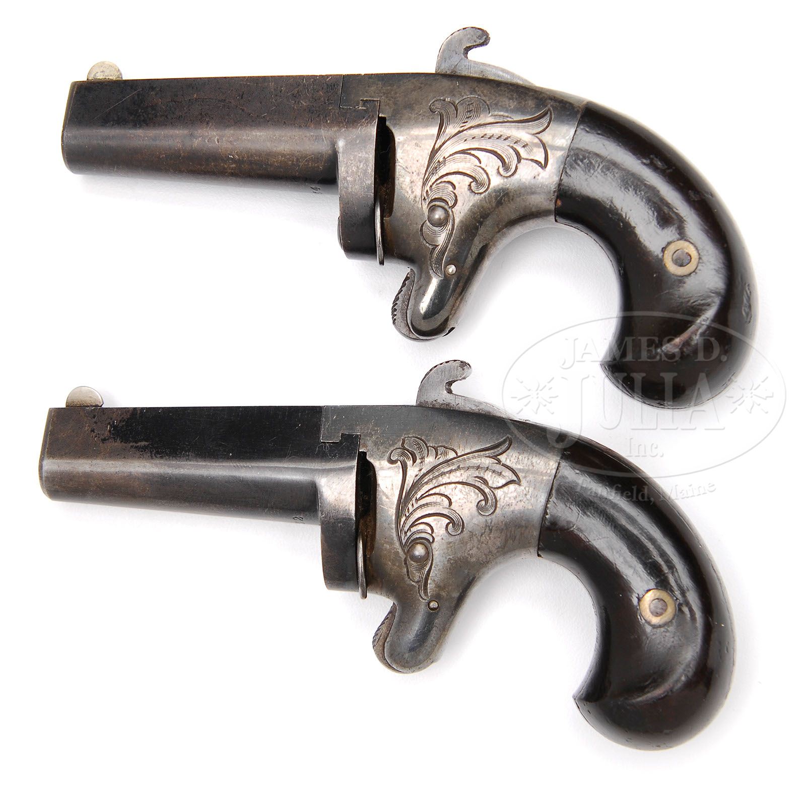 MATCHED PAIR OF NATIONAL FIREARMS CO. BROOKLYN, N.Y. 2nd MODEL DERINGERS. SN 11832 & 11754. Cal. 41 Short RF. SN 11832 & 11754.Silver plated iron frames and blued bbls. This pair was made very close to the end of production which ended at approximately 12000. They have piano finished varnished, plain, uncheckered walnut grips which are somewhat rare as only about 3% were finished this way. Matched pairs like these are rarely seen. Less than 6 pairs like this are known. PROVENANCE: Melvin Flanagan Collection, L.D. Eberhart Collection. CONDITION: SN 11832 retains 85% of orig bright blue on bbl; 90% of orig case colors on hammer; 80% of orig silver on frame. SN 11754 retains 25% bright blue with mixed patina and blue overall rest of bbl; 85% of orig case color on hammer; 90% of orig silver on frame. Both pairs of grips retain 90%+ of orig dark varnish. Both guns have rarely seen cartridge ejector, which was a $.50 option as were the plain grips. 4-47415 DE37 (6,000-8,000)