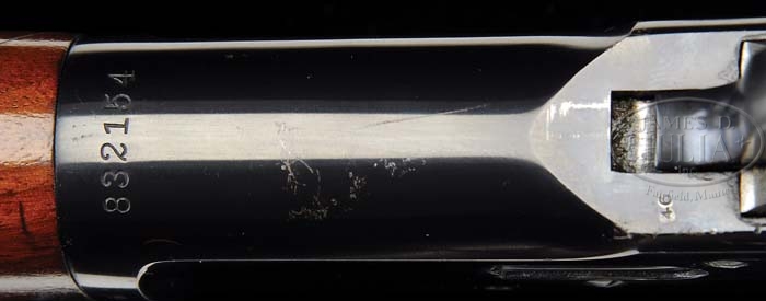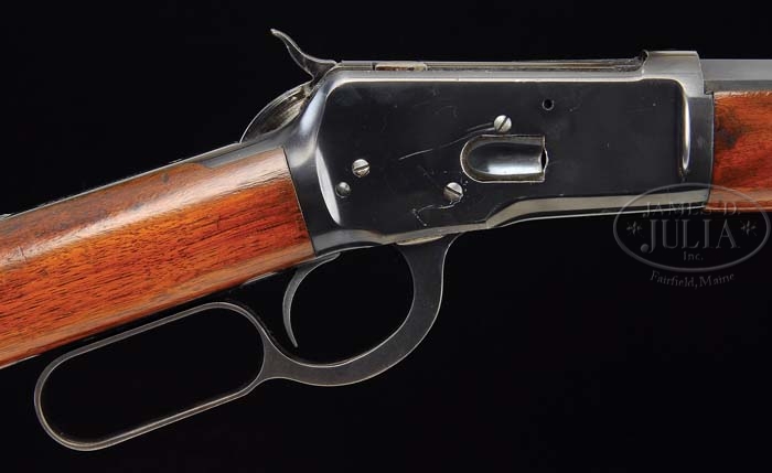*OUTSTANDING WINCHESTER MODEL 1892 LEVER ACTION RIFLE. SN 832154. Cal. 38 WCF. 24-1/4″ oct bbl, full mag, fine bead front sight with set screw, flat top “V” notch sporting rear sight, usual bbl markings, standard receiver. Mounted with straight grain walnut, crescent steel buttplate, standard forend with nosecap. CONDITION: Very fine. Bbl and mag tube retain 97-98% orig blue, slightly thinning on sharp edges, a couple minor areas of surface oxidation and the normal minor nicks & scratches. Receiver retains 97-98% orig blue, starting to thin on sharp edges, a couple spots of minor surface oxidation and normal minor nicks & scratches. Hammer retains orig blue with thinning on both sides. Lever retains orig blue blending with brown patina across bottom. Stock is sound, some minor handling marks, two minor dents in comb, a couple shallow scratches and retains most of its orig finsih. Buttplate retains orig blue, flaking and blending with brown patina. Forend is sound with some minor nicks & dings and retains most of its orig finsih. Mechanics are crisp with a bright shiny bore. 4-38791 BDT354 (5,000-8,000)