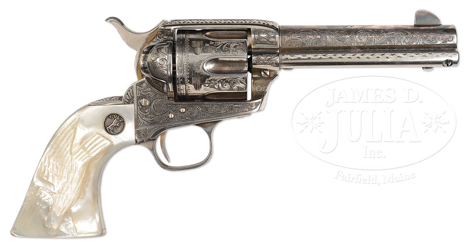 *SUPERB HELFRICHT ENGRAVED COLT SINGLE ACTION ARMY REVOLVER WITH WONDERFUL AZ HISTORY. SN 335045. Cal .38 WCF (38-40. Spectacular silver finished Single Action with 4-3/4″ bbl, full front sight and 2-line address with caliber marking on left side. Left side of frame has the 2-line, 3-patent dates and is mounted with spectacular 2-pc, Rampant Colt deep silver medallion pearl grips. Right side has a deep relief carved stooping eagle. Rear face of cylinder has last 4 digits of matching serial number. Revolver is engraved probably from the hand of the master himself, Cuno Helfricht, with about 80% coverage, very fine, intertwined foliate arabesque patterns with extremely fine pearled background. Left recoil shield is engraved in Mr. Helfrichts typical fan pattern with feather patterns on the top strap, diamond patterns on each side of bbl boss and his distinctive flower blossoms in the bottom front gullets. Matching foliate arabesque patterns extend the entire length of both sides of bbl with fine snake & dot patterns in the top gullet of the ejector housing along with fine zig-zag borders and leaf and vine pattern on the outer radius. Backstrap is engraved with Mr. Helfricht’s distinctive fan pattern at the top with geometric patterns downs the back and buttstraps with another of his distinctive patterns on the trigger bow. Cylinder is engraved with matching foliate arabesque patterns on the lands between the flutes, a line border around the flutes with a small sunburst at the rear end of the flutes. Rear edge of the cylinder is beautifully engraved in scallop and snake & dot patterns. This is one of Mr. Helfricht’s more elaborately engraved Single Actions. Accompanied by a Colt Factory letter which identifies this revolver in Cal 38-40 with 4-3/4″ bbl, silver finish, pearl grips with carved eagle motif, factory engraved and sold to Globe Hardware Co., address unavailable, shipped to Simmons Hardware Co., St. Louis, MO on January 24, 1917 in a one gun shipment. The Globe Hardware Co. in the letter, is located in Globe, AZ, and has been in business from 1898 to the present. Contact with a granddaughter of the orig owner of the company disclosed that some of the old records are still available. A search of those records disclosed that this revolver was received January 30, 1917 from Simmons Hardware Co. and was sold the same day to Alvin Booth. Contact with the Gila County, AZ Historical Museum revealed that Alvin Booth, a “colored” man, was born April 1, 1868 in Hillsboro, TX, settling in Globe to do handyman and janitorial services around town. Booth was a well known and respected figure in Globe, being employed by several prominent bankers and businessmen in town. Booth was very frugal, saved his money and purchased several investment properties in the area, becoming somewhat well-to-do. In 1913 he was chosen to attend the Emancipation Convention in Philadelphia to represent the Arizona colored population at the convention. His appointment was made by Governor George W. P. Hunt, who Booth had worked for when the governor was a businessman in Globe. He was also a delegate in 1920 to the convention of the Industrial and Commercial Council of People of African Descent. He was mentioned in “Arizona’s Black Pioneers” and several other publications noting prominent people of early Arizona. Booth died March 16, 1937 in Globe, AZ, and was laid to rest in the “white man’s cemetery” next to his father who had joined him in Globe in his later years. PROVENANCE: Fax correspondence from Gila County, AZ Historical Museum. CONDITION: Extremely fine plus and all matching. Overall retains virtually all of its crisp, orig silver finish which is lightly oxidized, showing no wear. Revolver appears to be new and unfired. Grips are crisp with no visible flaws. Mechanics are crisp, brilliant shiny bore shows no evidence of having ever been fired. An absolutely spectacular example of the engravers art and finisher’s polishing skills. This revolver is nearly identical to another Single Action from the same time frame, being sold elsewhere in this auction. 4-49405 JR311 (65,000-85,000)