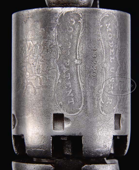 COLT 3RD MODEL DRAGOON PERCUSSION REVOLVER. SN 19220. Cal. 44. Late 3rd model with rare 8″ oct to rnd bbl, German silver front sight and New York City address on top flat. Left side of frame is marked with a small “COLTS PATENT” and it has silver plated brass trigger guard & back strap containing a varnished 1-pc walnut grip with last four digits of the serial number in the back strap channel. Cylinder has usual Ranger/Indian fight scene with four of six safety pins prominent. Few of these late 3rd models were produced with 8″ bbls making this a rare variation. CONDITION: Fine, all matching including wedge & grip. No orig finish remains being an overall cleaned gray metal patina. Muzzle edge shows moderate to heavy wear. Cylinder retains 60-70% Ranger/Indian fight scene. Trigger guard & back strap retain traces of orig silver being mostly a light to medium mustard patina. Grip is sound showing moderate wear with nicks & scratches and retains 75-80% orig varnish. Mechanics are fine, strong bore with good shine & scattered moderate pitting. 4-37811 JR240 (10,000-15,000)