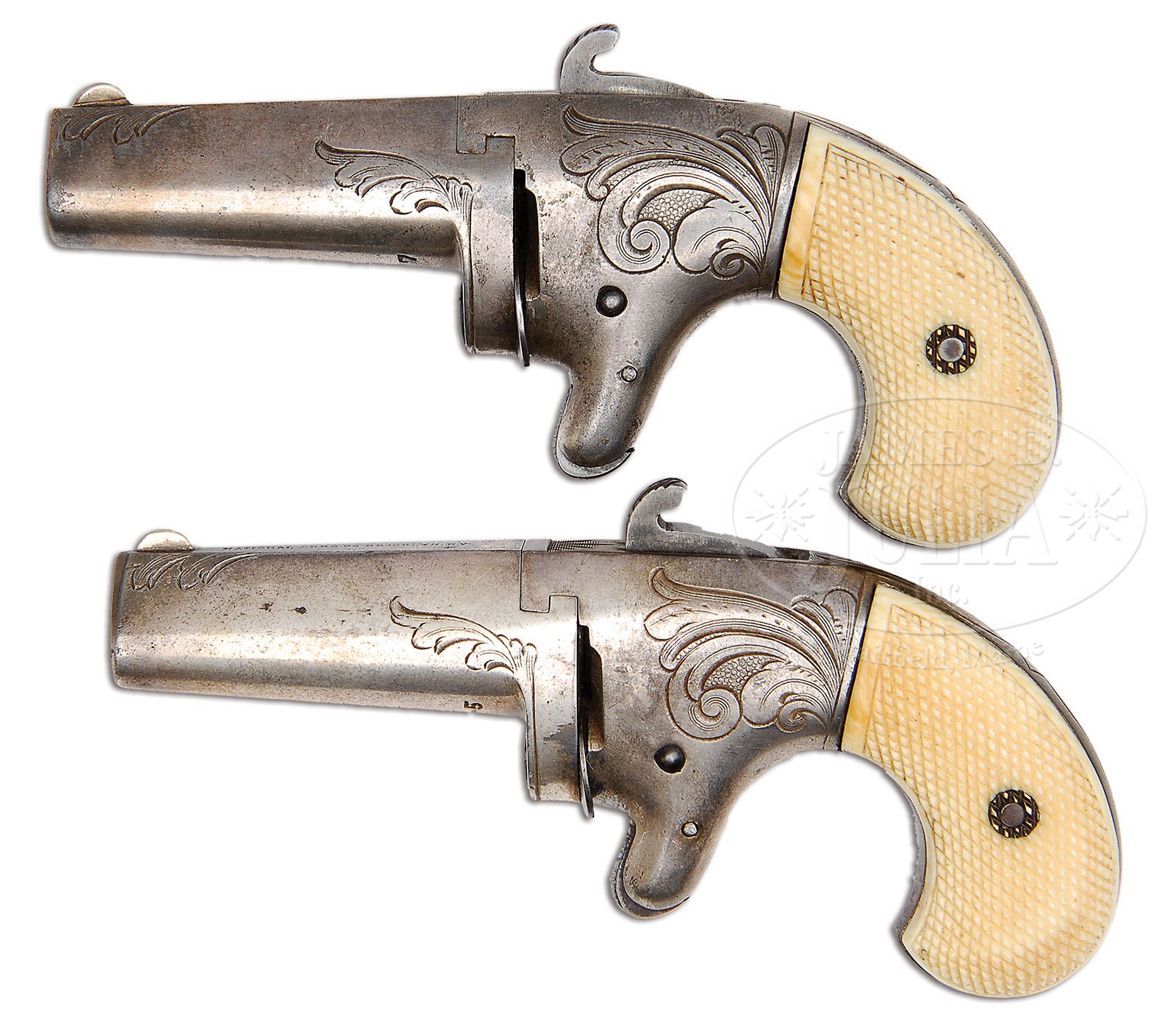 MATCHED PAIR NATIONAL FIREARMS CO. BROOKLYN, N.Y. 2nd MODEL DERINGERS. SN 8637 & 8645. Cal. 41 Short RF. Iron framed Nationals. Finished in overall silver plate. Triggers, hammers and ejectors retain case colors. Special order ivory grips are completely checkered rather than the standard National pattern. Grips, which were probably sent out for checkering, were totally checkered right through the escutcheon plates that are period and correct to these guns. PROVENANCE: L.D. Eberhart Collection. CONDITION: SN 8637 retains most of the orig silver plate over entire bbl with some wear at muzzle edges. Strong company markings on top bbl flat; iron frames retain probably 70%+ of orig silver. Nice case color on hammer. There is some age shrinkage to the ivory grips but there are no breaks scratches, etc…SN 8645 has 90%+ of orig silver on bbl with strong bbl markings and strong case color on hammer with 70% silver plate remaining on frame. Grips have no dings or chips but some age shrinking and are a nice mellow, aged color. 4-47417 DE39 (5,500-8,500)
