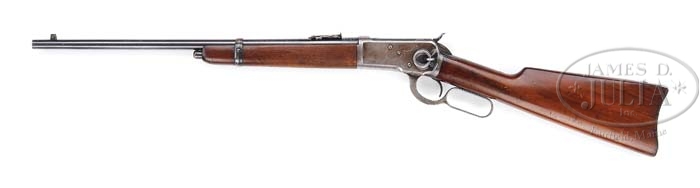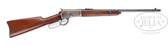 *WINCHESTER MODEL92 SADDLE RING CARBINE. SN 588442. CAL. 32WCF 20″ round bbl half mag square base with pinned ivory bead front sight, standard carbine ladder rear sight. Left side of bbl is marked “MANUFACTURED BY THE WINCHESTER REPEATING ARMS CO./NEW HAVEN, CONN. U.S.A. PATENTED OCTOBER 14. 1884”. Adjacent receiver 32W.C.F. Standard receiver with staple and saddle ring on left side. Mounted with straight grain walnut, straight grip, steel carbine buttplate, 9-1/8″ forend with band. CONDITION: Fine. Bbl retains 90% original blue with minor muzzle wear, a few nicks and scratches, and slightly thinning at chamber area. Receiver has flaked and worn to traces of original blue at saddle ring and blending a smooth silver and brown patina. Prominent ring mark on left side. Stocks are sound with usual nicks, dings, and handling marks and retains original finish blending with hand-worn patina. Forend is sound with usual marks and shows hand-worn patina blending with original finish. Mechanics are crisp with a nice shiny bore. 4-38665 BDT222 (1,750-2,250)