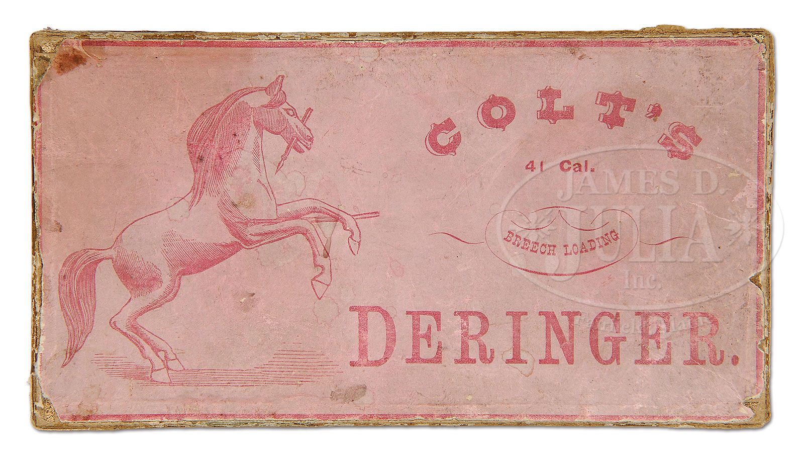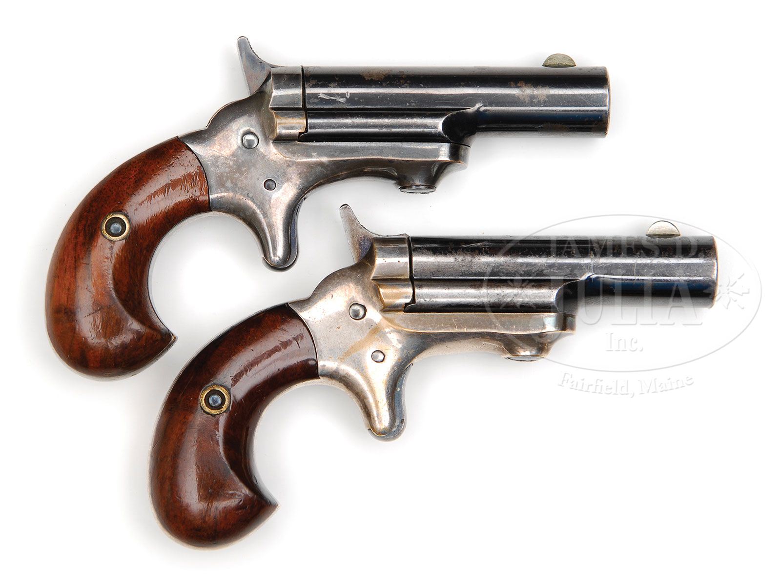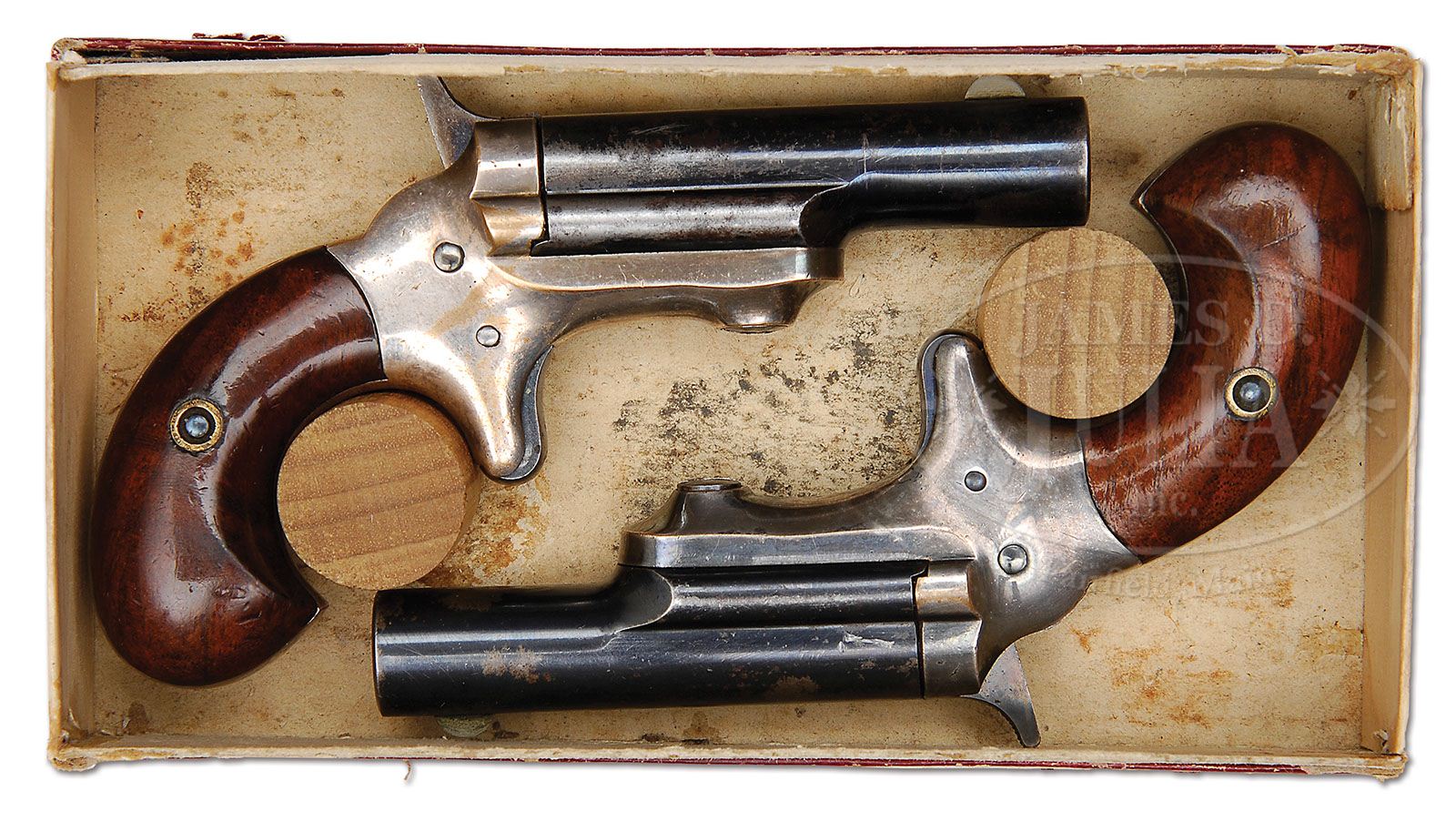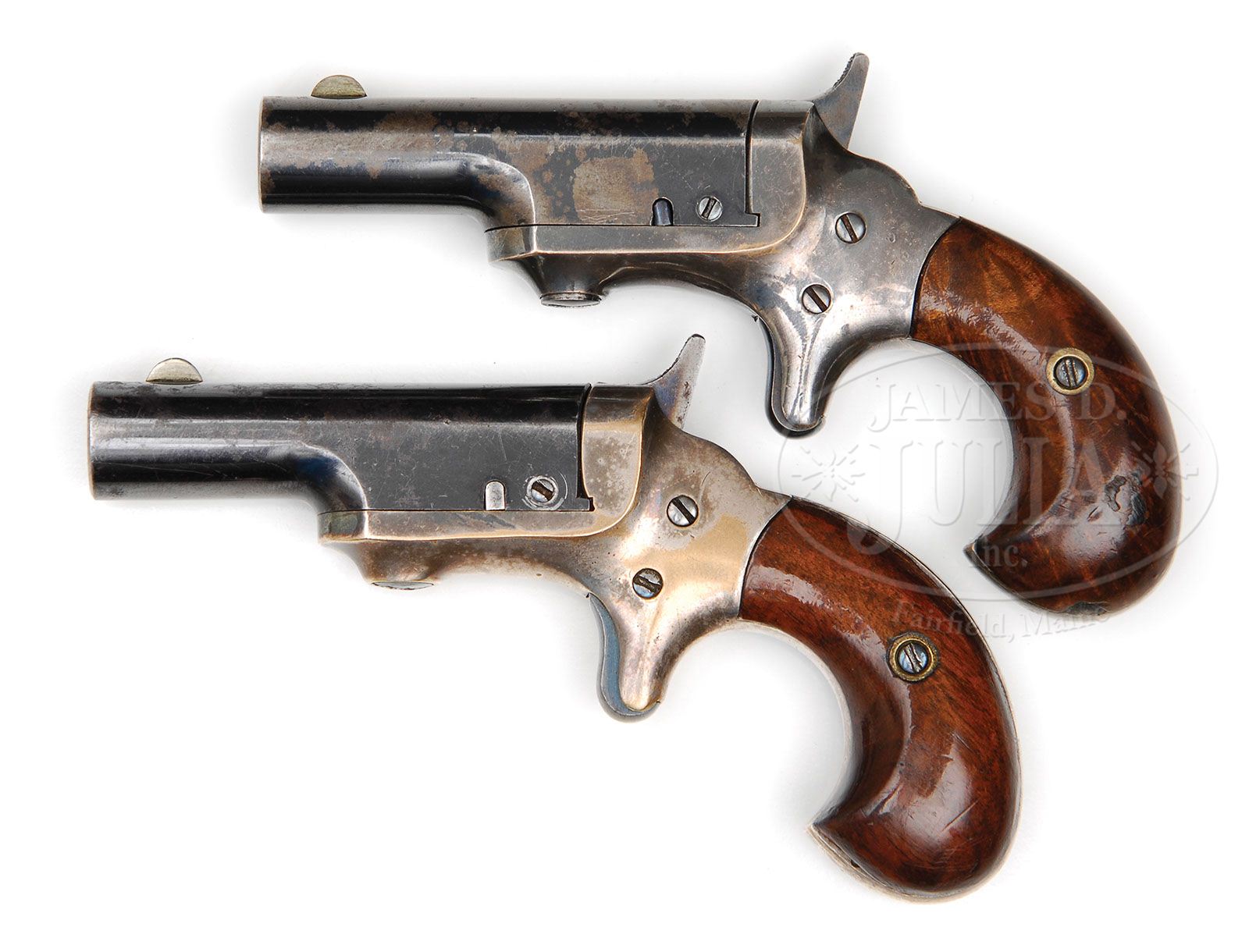 THIS PAIR OF 1ST TYPE 3RD MODEL DERINGERS HAVE THE SMALL COLT ADDRESS. SN 136 & 1255. Cal 41. Short rim fire. There were slightly less than 500 of these produced, and then the Colt stamping went to the larger Colt which carried on through to the end of production. Explanation about SN 1255: There will be a copy of L.D. Eberhart’s story about these type weapons which will accompany these guns to the new owner which explains in detail how three of these very rare guns were found to be out of the normal series range. Both guns are original in every way, Cal 41 short rim fire. Are two of the finest examples of the 19 guns that are still known to be remaining of the original 500 production. PROVENANCE: L.D. Eberhart Collection CONDITION: SN 136: This gun retains 90%+ of the original silver plate on the frame. All the screws as well as the trigger still have their bright blue finish. The high hammer retains 90% of its original case color. The bbl which shows some flaking on the left-hand side still retains 75% of the original bright blue as it was issued. The walnut grips are very bright and light and have not been darkened by oil stains or age. they retain 95% of their original varnish. SN 1255: This gun retains 85%+ of the original silver plate, screw heads etc retain most of the original fire blue. The high hammer retains 90% of its original case color. Blue trigger has total blue coverage. The grips are nice walnut and have almost full coverage original varnish and are still nice bright color. The bbl itself with some wear retains 70% of bright blue as issued. This very rare pair of guns are housed in their original 1st type cardboard box which to the author’s knowledge, there are only four known examples remaining. 4-47428 DE47 (25,000-35,000)
