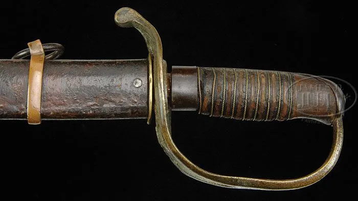 CONFEDERATE NASHVILLE PLOW WORKS CAVALRY SABER. This is a nice example of a very popular Confederate sword with “CSA” cast into bottom of guard. This particular example is the variation that has iron instead of brass backstrap and ferrule. William Albaugh attributes these swords to College Hill Armory which was another Nashville sword manufacturer. Albaugh believes these to be by this maker due to the fact that the maker’s mark “NASHVILLE PLOW WORKS” is filled in and appears as a ribbon in this particular variation. Regardless of maker, this popular Nashville made sword is a good example with orig grip and accompanying Confederate made scabbard that would display well in any collection. PROVENANCE: Fred & Nancy Edmunds CONDITION: 36″ blade is smooth and brown with scattered areas of pitting, old sharpening and numerous small nicks in cutting edge. Blade appears to have old cleaning and been chemically “browned”. Blade is missing its protective washer such that guard has about a 1/16″ gap between guard and grip ferrule. Carved wood grip retains about 40% of its orig leather grip which is now dry, flaking and worn, especially at high areas. Thin twisted brass wire appears orig though is slightly loose. Brass hilt exhibits mustard/bronze patina with scattered areas of staining. Iron backstrap and ferrule are smooth and brown with staining and pitting. Accompanying scabbard is Confederate but not a product normally seen with this maker. Scabbard is most likely a product of the Confederate States Armory in Kenansville, N.C. Scabbard is sound and solid with good mustard colored patina to brass ring mounts. Scabbard body retains some orig red/brown paint though overall rusted and pitted with one large dent about 6″ below middle mount. Brass drag is a replacement, orig scabbard would have had an iron blade. 4-46651 JS29 (7,000-9,000)