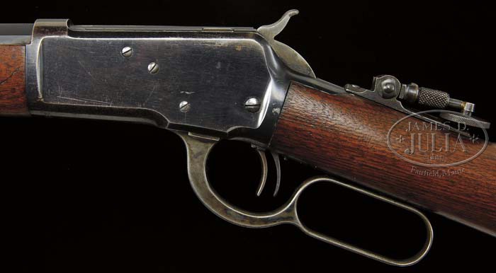 RARE SPECIAL ORDER WINCHESTER MODEL 1892 LEVER ACTION RIFLE. SN 53168. Cal. 25-20. Standard grade rifle with very rare 30″ oct bbl, full magazine with ivory bead combination front sight, semi-buckhorn rear sight and a large disc Lyman combination tang sight. Receiver is mounted with close-coupled dbl set triggers. Mounted with uncheckered straight grain American walnut with straight stock and crescent steel buttplate. Accompanied by a Cody Firearms Museum letter identifying this rifle in caliber 25-20 with 30″ oct bbl and set trigger, received in warehouse Jan. 20, 1899 and shipped next day to Order #20516. Any special order features on a standard grade ’92 is considered rare. The small bore ’92s were considered to be insufficient for big game and so were relegated to secondary status, primarily for women & boys and as such usually received less care & attention and are frequently found with little or no orig finish. PROVENANCE: Wes Adams Estate Collection. CONDITION: Fine to very fine. Bbl retains about 95% strong orig blue with sharp edge wear and a few scattered freckles of light surface rust; magazine tube is mostly all of a plum/blue patina; receiver retains 88-90% orig blue, stronger on the sides, thinner over the top & bottom with sharp edge wear and some minor candy striping with a couple of small nicks; wood is sound with a few light handling & storage nicks & scratches with the buttstock retaining most of its orig finish and the forearm a smooth hand worn patina with some nicks & dings on the bottom. Mechanics are crisp, bright shiny bore. 4-44606 JR495 (6,000-10,000)
