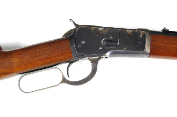 *EXTREMELY RARE SPECIAL ORDER WINCHESTER MODEL 1892 SMOOTH BORE SADDLE RING CARBINE. SN 770947. Cal. 44 WCF. (44-40). Special order standard grade carbine with 20″ smooth bore bbl, button magazine, square base front sight and 3-leaf platinum line express rear sight. Left side of receiver has a staple & ring. Mounted with straight grain, uncheckered, American walnut with straight stock & Winchester hard rubber buttplate. Carbines such as this one are rarely found with high orig finish. This carbine, produced in 1914, was made during the time when the West was becoming more & more safe but was still a time of cowboys & outlaws where firearms such as this were carried in saddle scabbards or wagon boxes or even early automobiles, usually under adverse conditions with little maintenance. Given that the bbl on this carbine is smooth bore, it is readily apparent that it was probably intended for one of the trick shooters employed by one of the Wild West Shows of that era, such as Buffalo Bill’s Wild West or Pawnee Bill’s Wild West Show or any one of a myriad of other such entertainment venues. PROVENANCE: Wes Adams Estate Collection. CONDITION: Very fine. Bbl & magazine tube retain about 99% strong, bright orig blue; bbl band retains about 60% blue with balance flaked, not worn, to a medium patina; receiver retains about 75% glossy orig blue wit balance flaked, not worn, to a medium patina, with light sharp edge wear; top tang is also flaked to a medium patina; hammer retains strong case colors, turned dark on top edge; lever retains strong case colors on sides and upper half of the outer face with the loop faded to silver; wood is sound with some light nicks & scratches and retains about all of its orig factory finish. Mechanic are crisp, brilliant shiny bore; has seen little or no use. 4-44672 MGM457 (5,000-8,000)